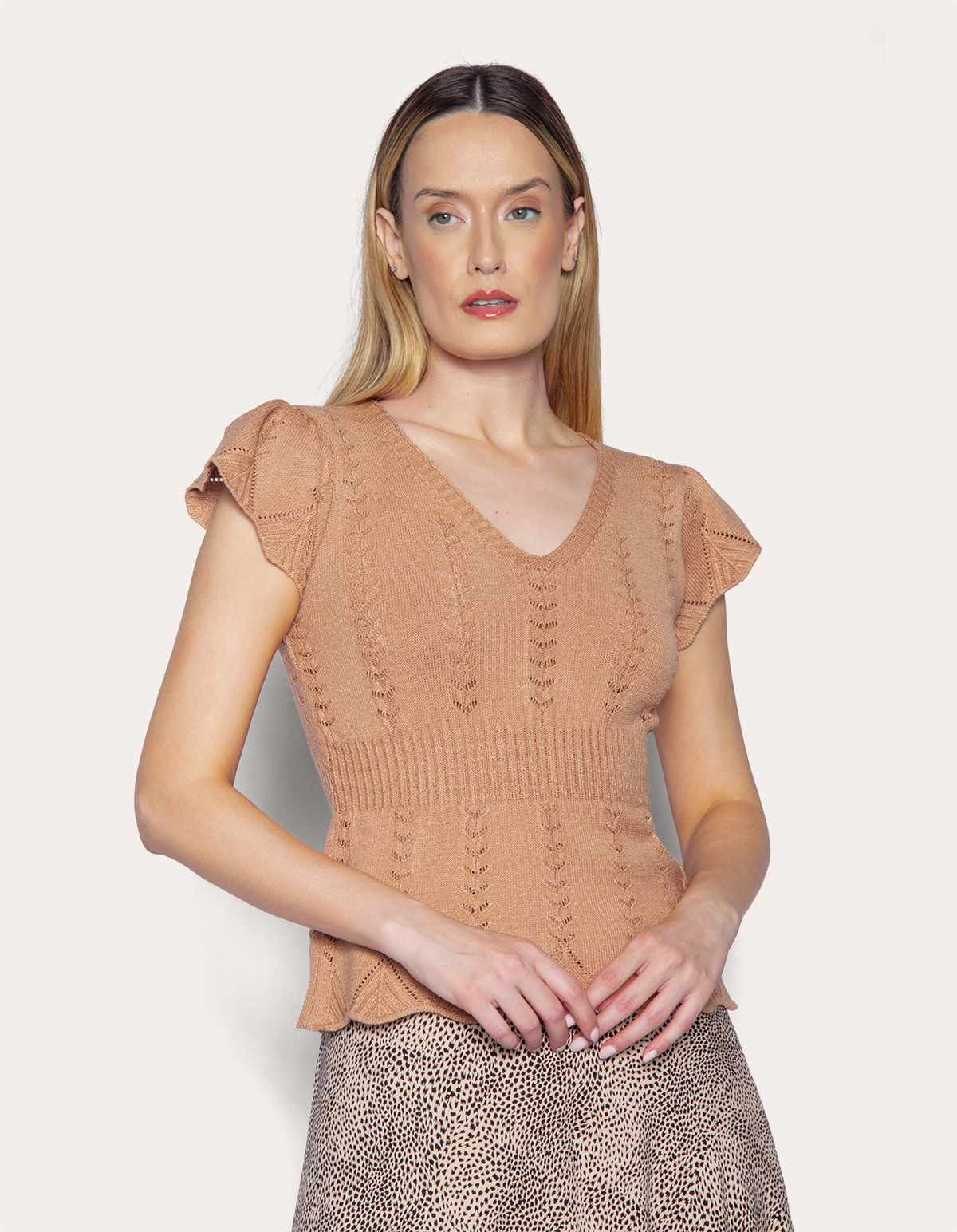 uma opção comfy chic para a meia-estação. com decote v e acabamento em babado, a peça em tricot leve empresta um toque vintage aos looks. combine com a saia plissada para um visual romântico e sofisticado.