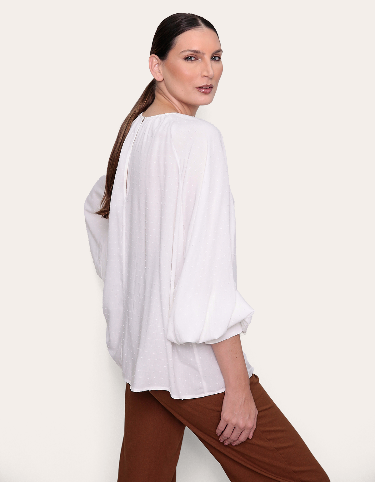 Blusa ampla com mangas longas: esta blusa ampla é ideal para quem busca conforto e estilo. o decote redondo confere um acabamento impecável. as mangas deslocadas apresentam franzidos na parte superior e inferior, enquanto os punhos estruturados garantem um toque sofisticado, resultando em uma peça versátil e elegante, perfeita para diversas ocasiões.