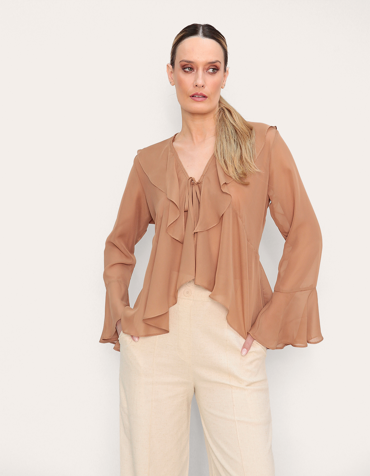 Bata manga longa sino, com babado na gola e barra, fechamento por amarração na frente. elegante e versátil, essa blusa une sofisticação e conforto em um só look. o babado frontal e na barra adicionam leveza e charme, enquanto as mangas longas sino garantem praticidade. feita para quem busca estilo sem esforço, ela transita do casual ao sofisticado, elevando qualquer produção com um toque refinado.