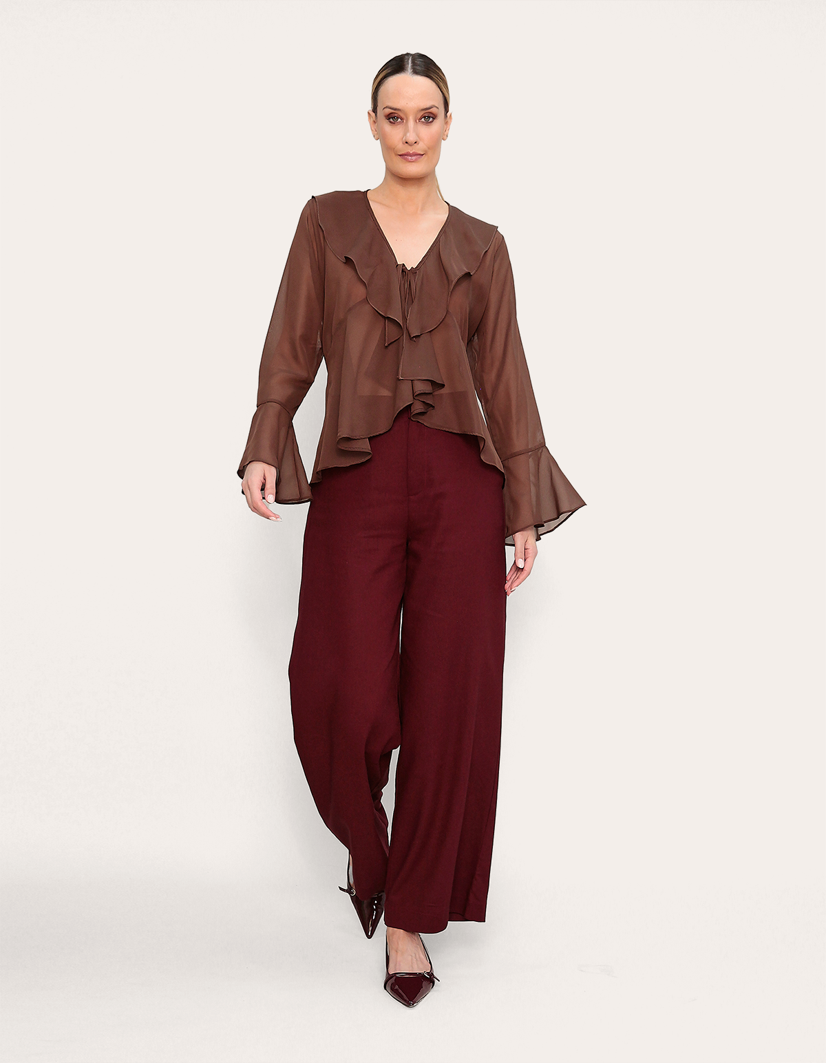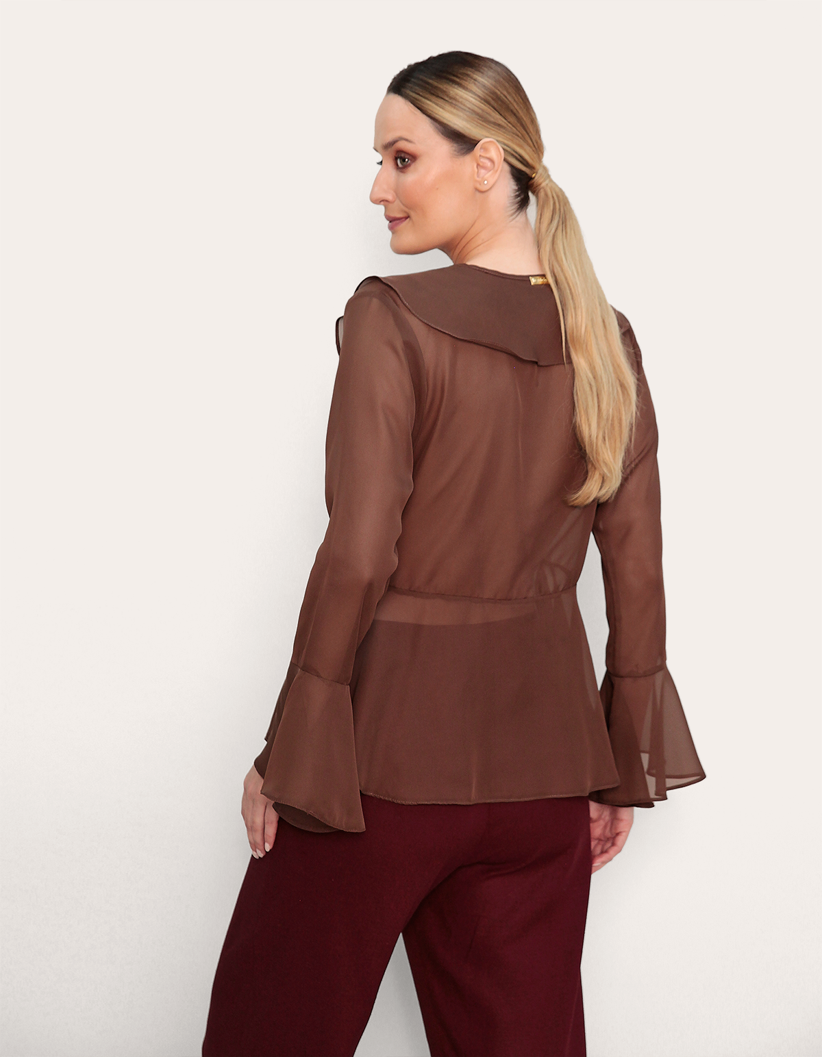 Bata manga longa sino, com babado na gola e barra, fechamento por amarração na frente. elegante e versátil, essa blusa une sofisticação e conforto em um só look. o babado frontal e na barra adicionam leveza e charme, enquanto as mangas longas sino garantem praticidade. feita para quem busca estilo sem esforço, ela transita do casual ao sofisticado, elevando qualquer produção com um toque refinado.
