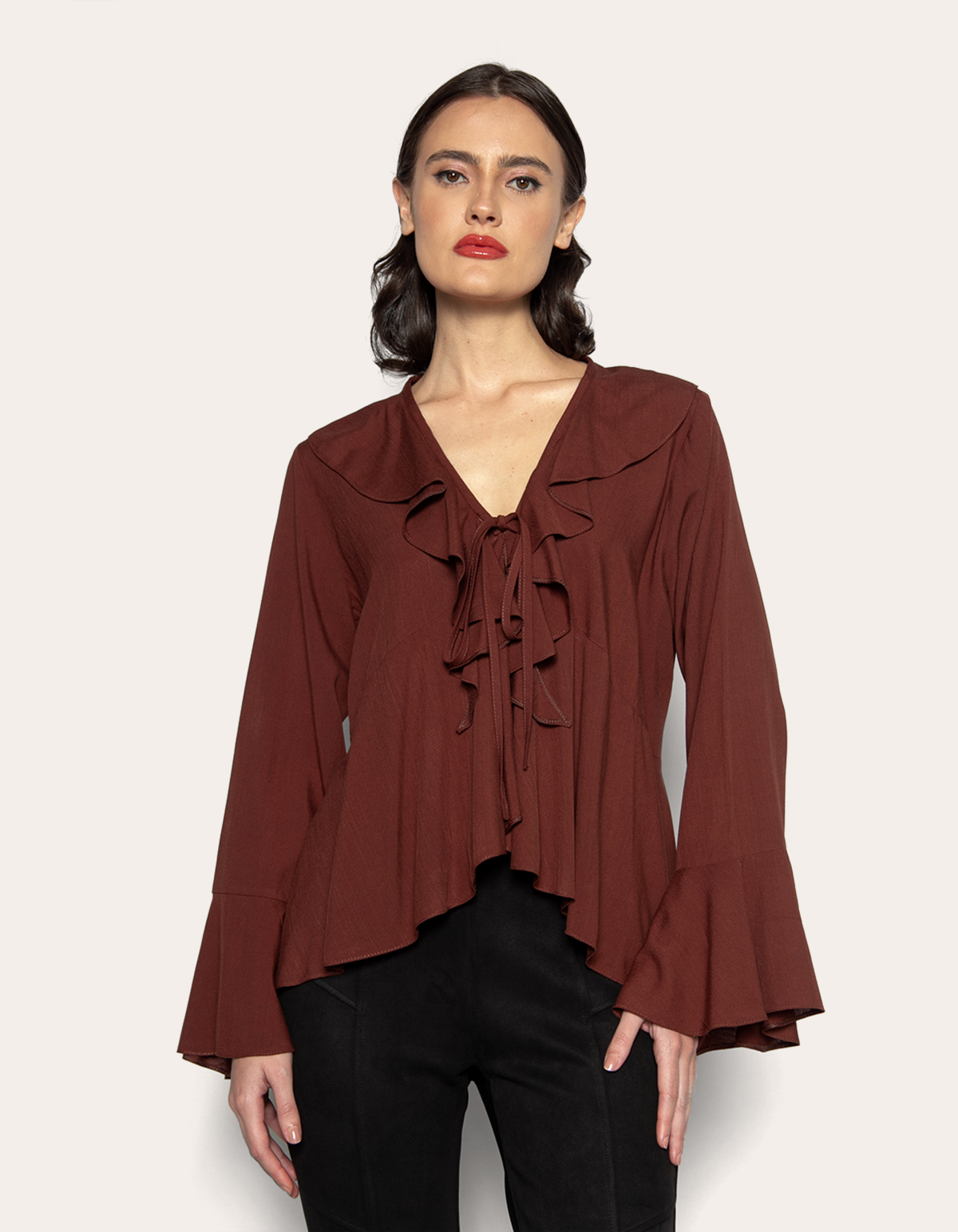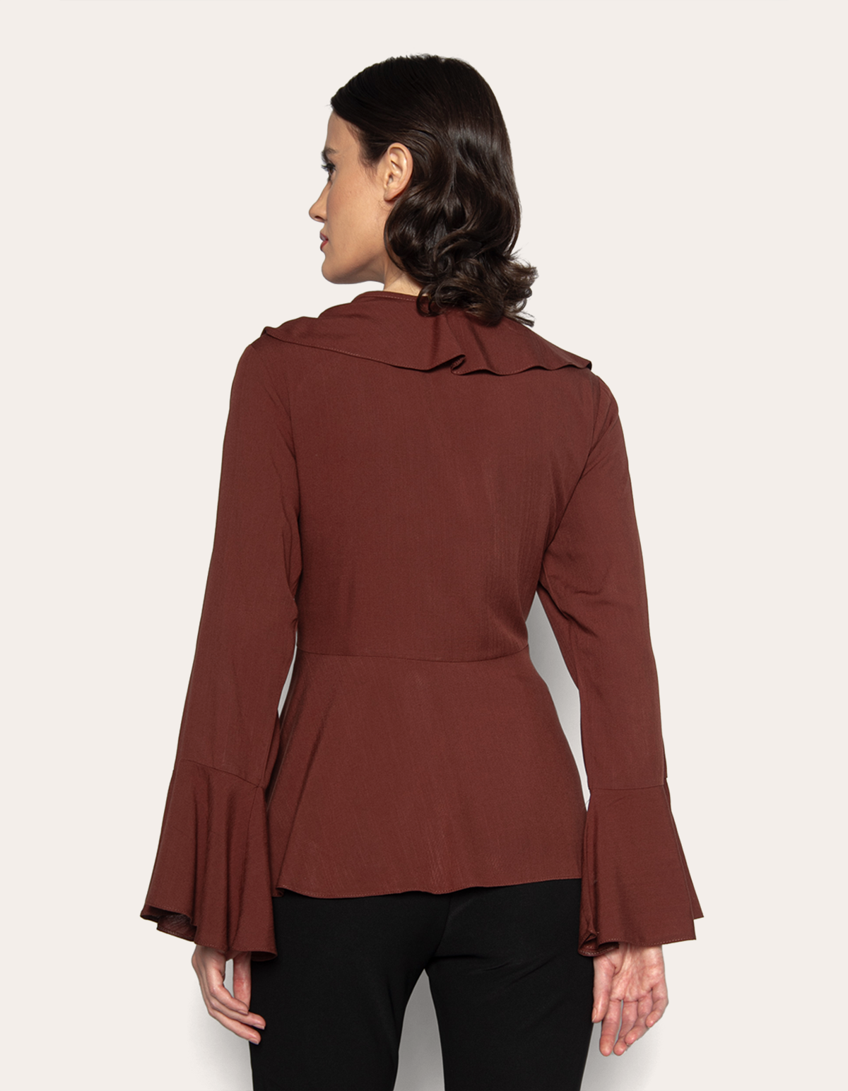 Bata manga longa sino, com babado na gola e barra, fechamento por amarração na frente. elegante e versátil, essa blusa une sofisticação e conforto em um só look. o babado frontal e na barra adicionam leveza e charme, enquanto as mangas longas sino garantem praticidade. feita para quem busca estilo sem esforço, ela transita do casual ao sofisticado, elevando qualquer produção com um toque refinado.