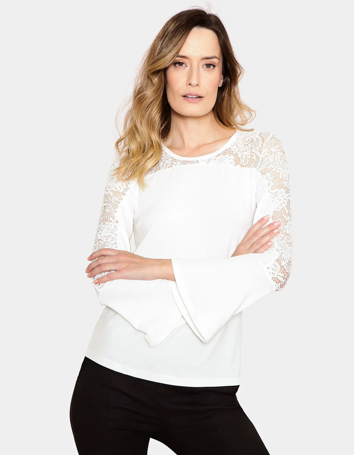Blusa manga longa boca sino pala renda