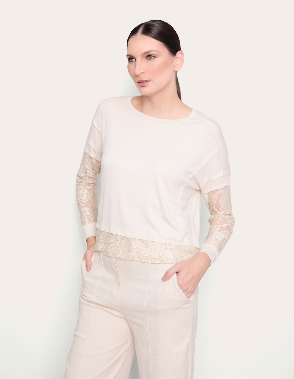 Blusa manga longa e barra renda