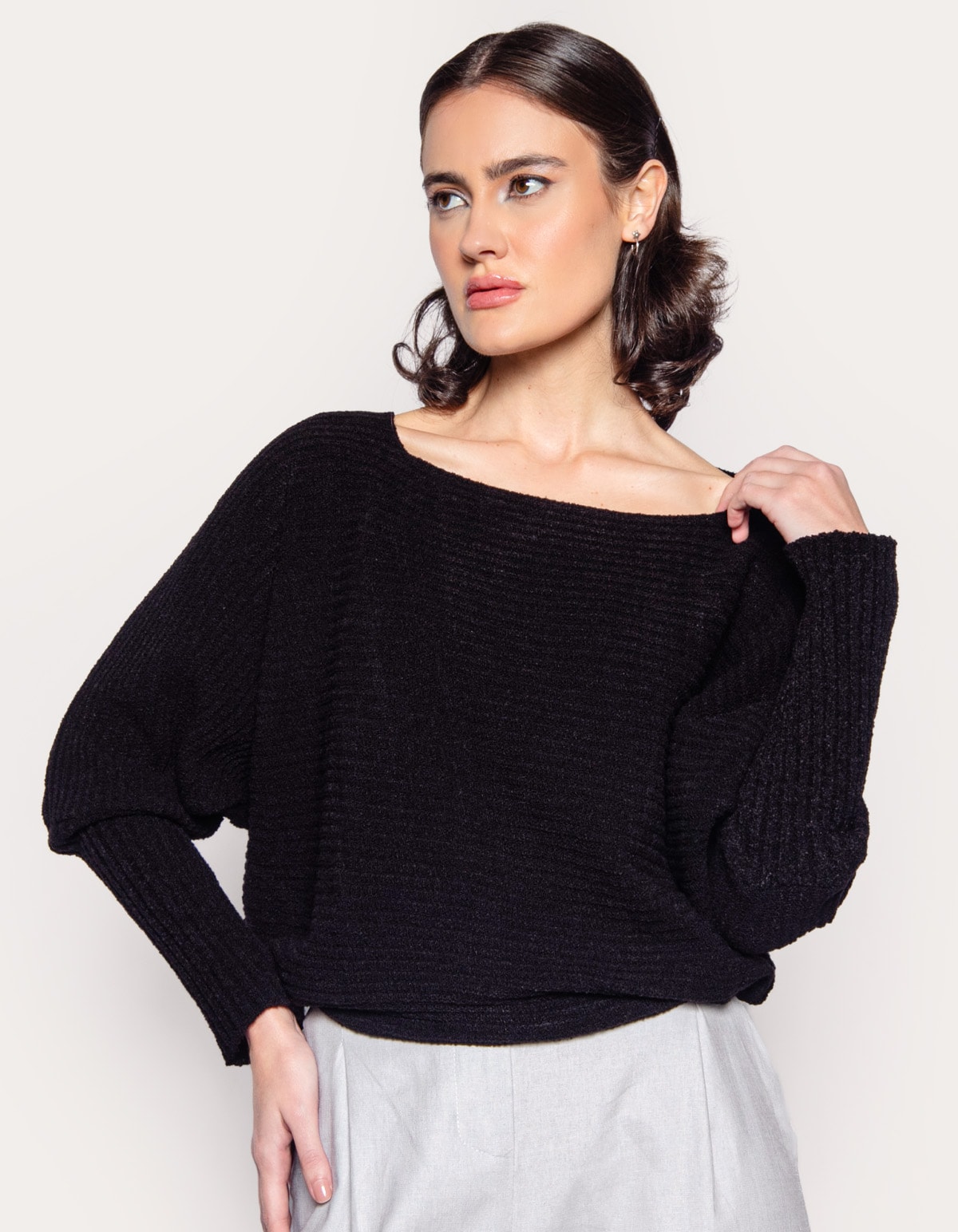 Blusa manga longa, tricot canelado de toque macio e quente, decote canoa. Com mangas estilo morcego e gola aberta, ele é perfeito para adicionar uma pitada de arte e moda ao seu guarda-roupa. Seu design exclusivo e luxuoso irá garantir que você se destaque em qualquer ocasião.