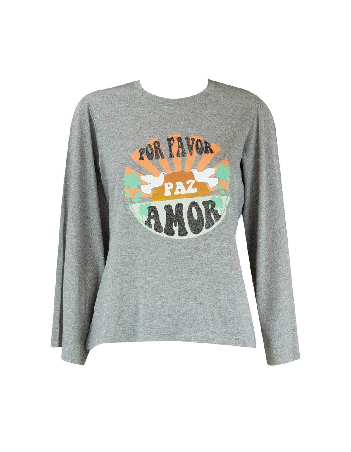 Blusa feminina de manga longa com estampa por favor paz e amor.