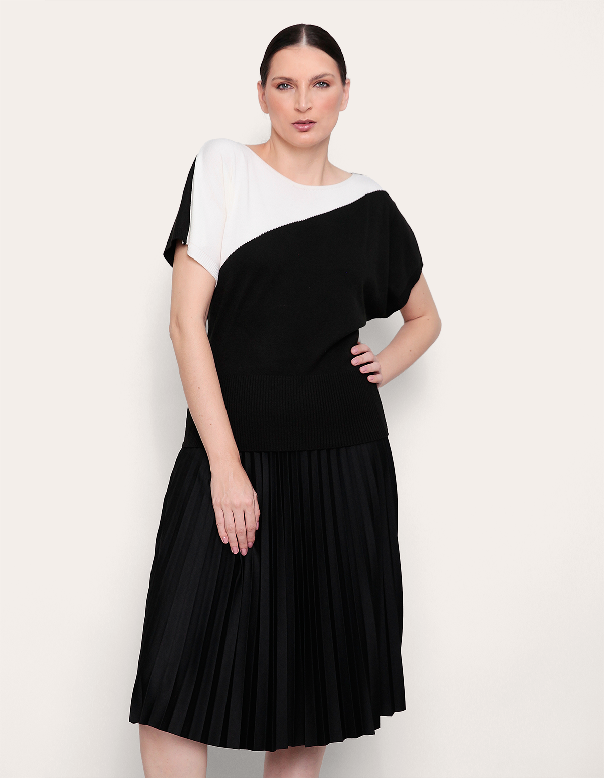 Blusa confeccionada em tricot com toque macio. a peça possui modelagem reta com caimento levemente solto, decote redondo, mangas curtas, bicolor em cores contrastantes. ideal para uma mulher moderna que está sempre apostando em tendências para um visual descontraído sem perder a sofisticação. combine com calças em alfaiataria, aposte em cores presentes na blusa. uma boa dica é: aposte em colares maximalistas para realçar a gola redonda.