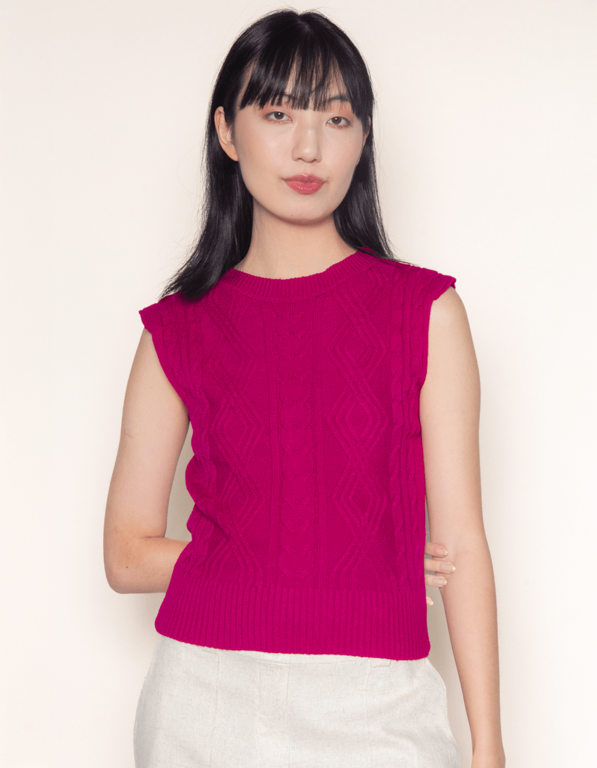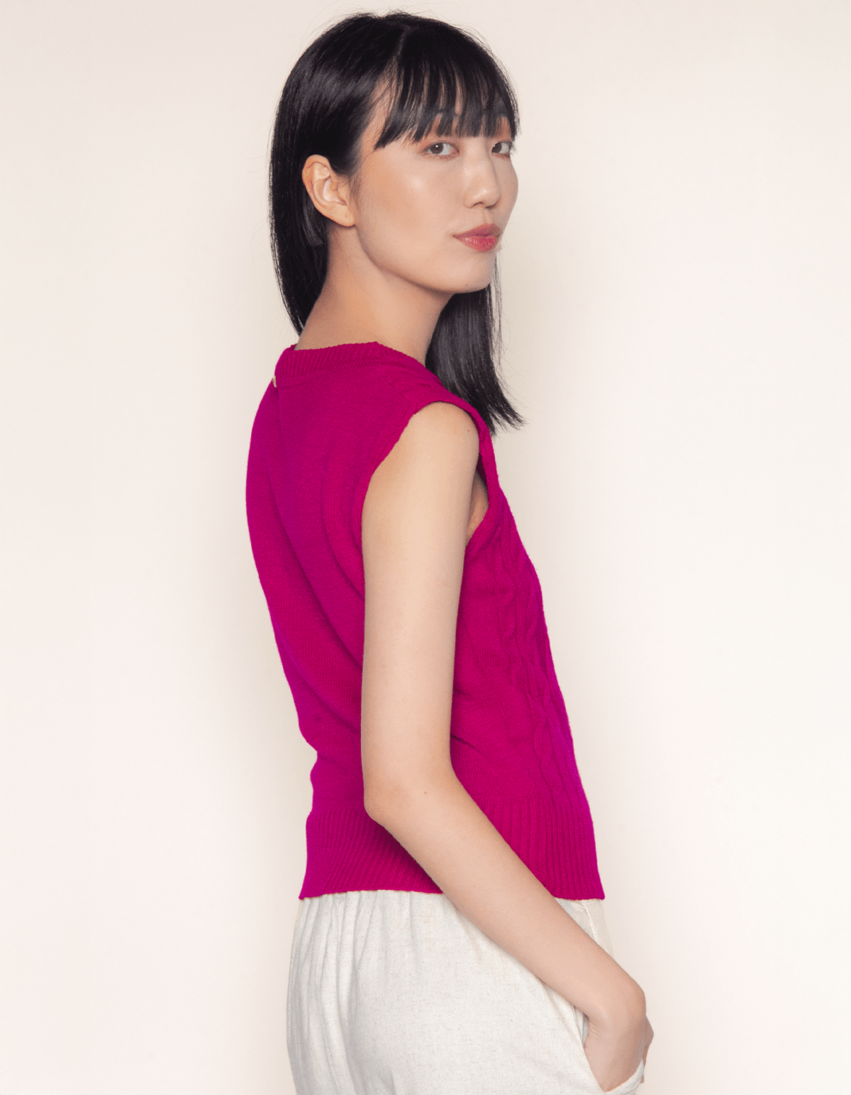 A blusa é confeccionada em tricot, combinando estilo e conforto. com detalhes de trança e losangulos que adicionam textura e elegância. sem manga, esta peça é versátil para várias ocasiões - ideal para looks de dias mais quentes ou com sobreposições, a blusa oferece um toque artesanal e sofisticado ao seu visual. perfeita para combinar com peças de cintura alta, essa blusa sem manga de tricot é uma escolha moderna e charmosa.