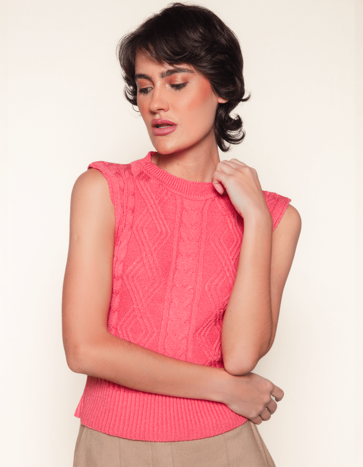 A blusa é confeccionada em tricot, combinando estilo e conforto. com detalhes de trança e losangulos que adicionam textura e elegância. sem manga, esta peça é versátil para várias ocasiões - ideal para looks de dias mais quentes ou com sobreposições, a blusa oferece um toque artesanal e sofisticado ao seu visual. perfeita para combinar com peças de cintura alta, essa blusa sem manga de tricot é uma escolha moderna e charmosa.