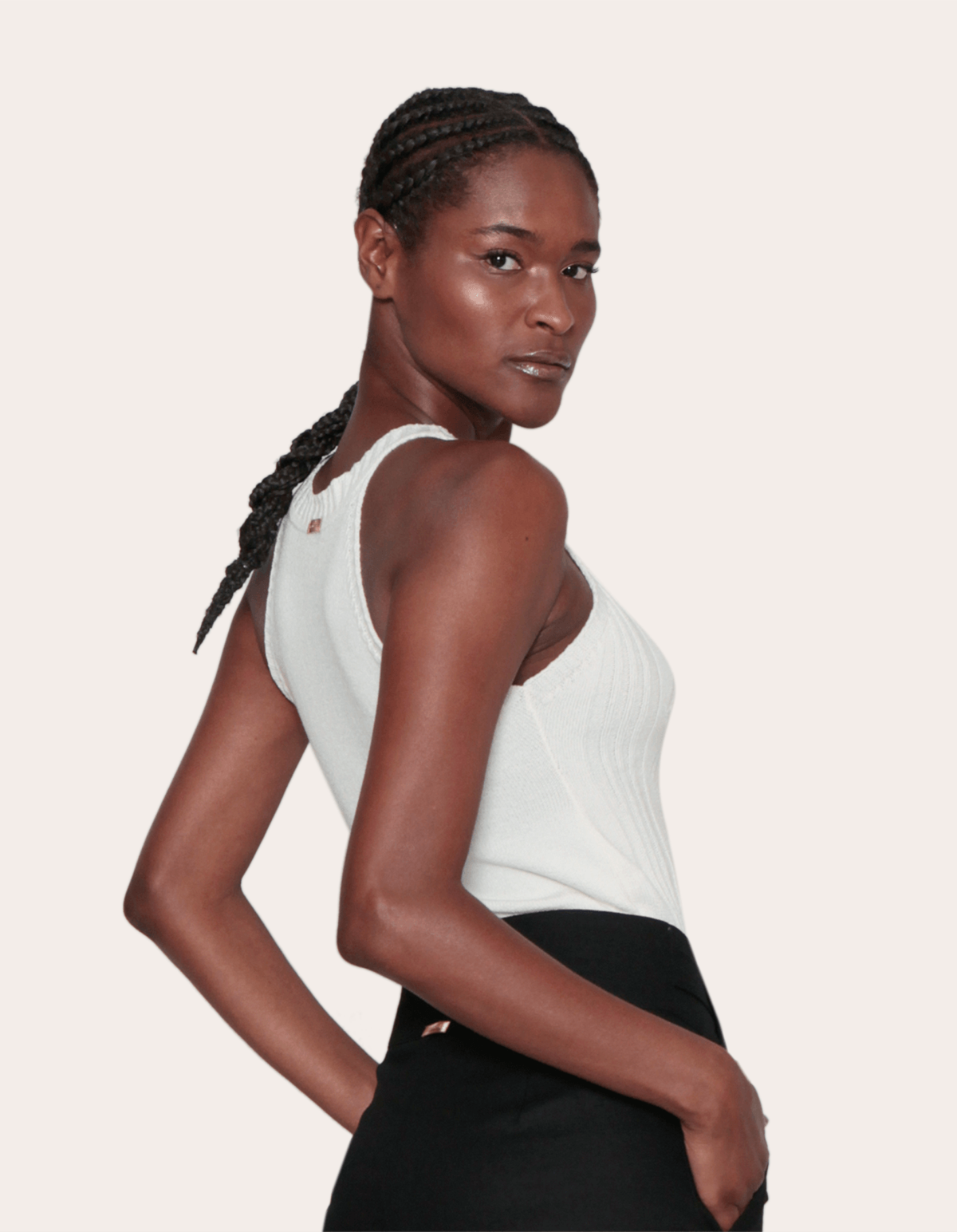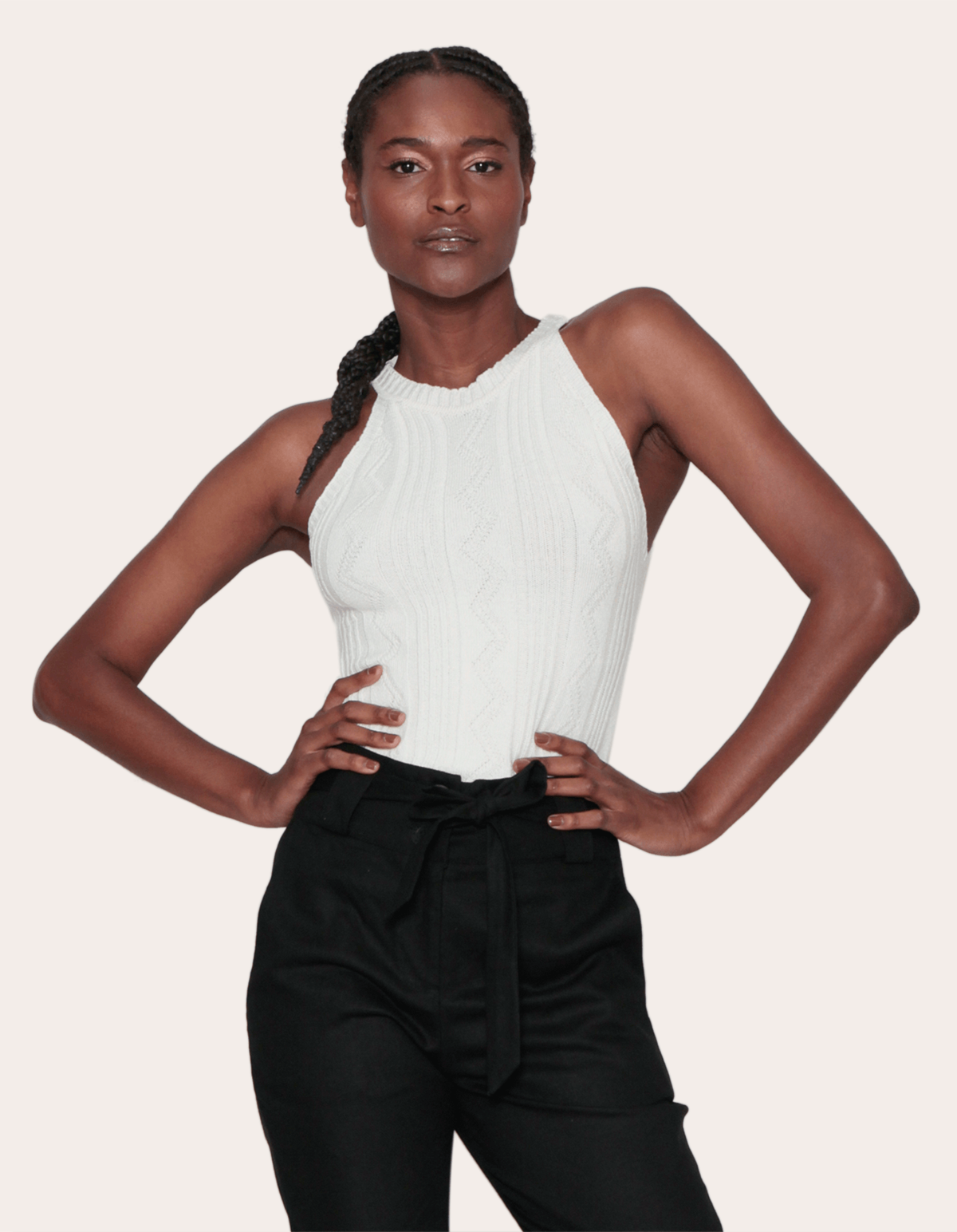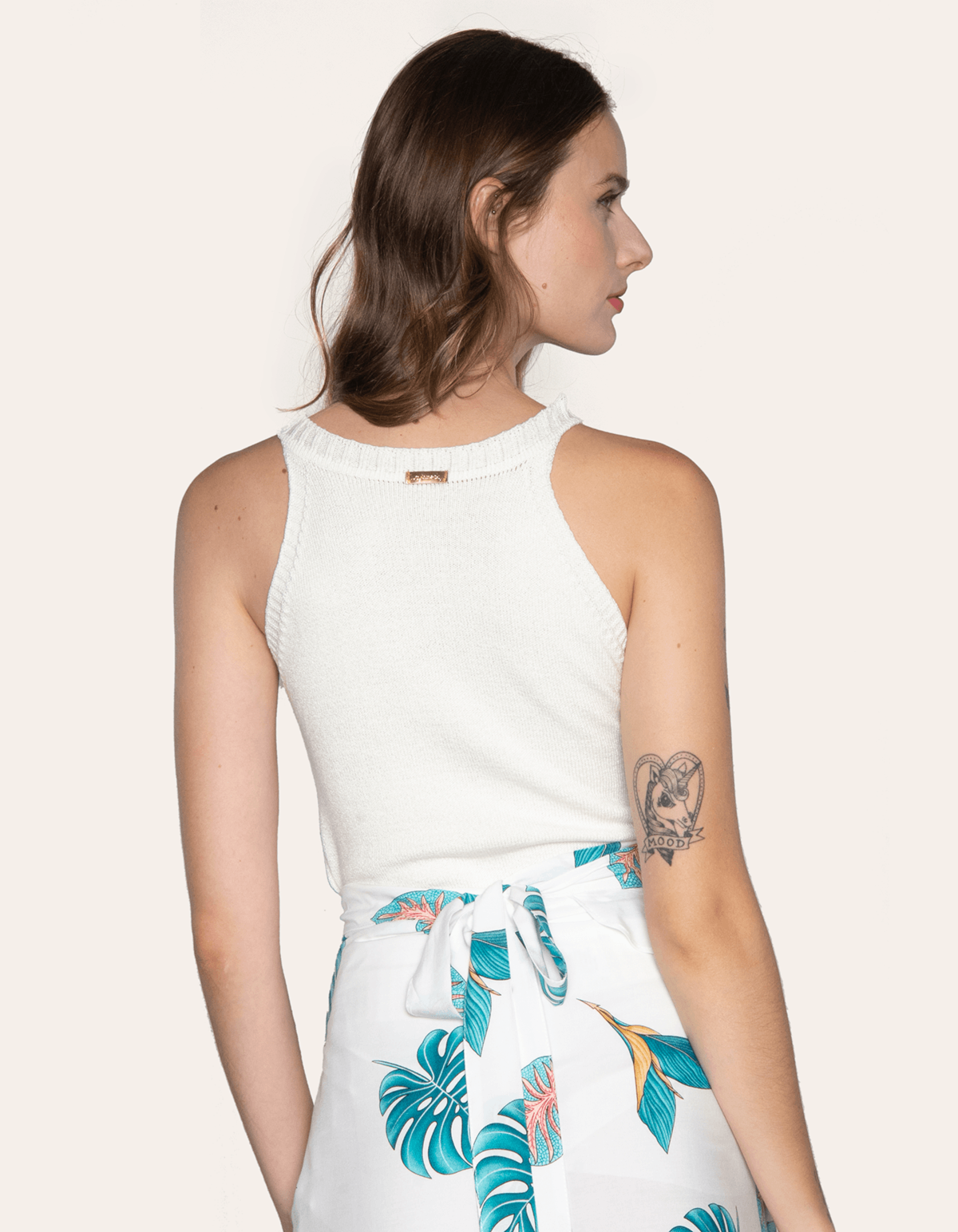 A blusa é confeccionada em tricot, combinando estilo e conforto. com detalhes de zig zag e listras que adicionam textura e elegância. sem manga, esta peça é versátil para várias ocasiões - ideal para looks de dias mais quentes ou com sobreposições, a blusa oferece um toque artesanal e sofisticado ao seu visual. perfeita para combinar com peças de cintura alta, essa blusa sem manga de tricot é uma escolha moderna e charmosa.