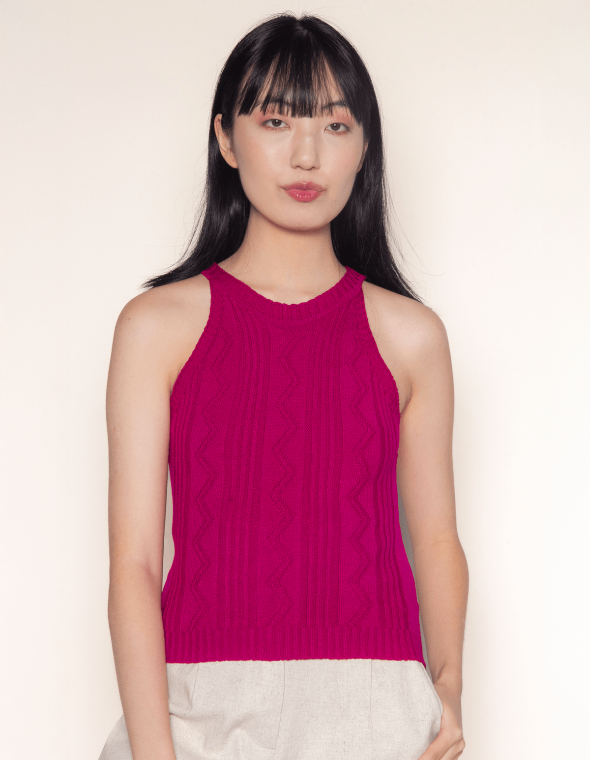 A blusa é confeccionada em tricot, combinando estilo e conforto. com detalhes de zig zag e listras que adicionam textura e elegância. sem manga, esta peça é versátil para várias ocasiões - ideal para looks de dias mais quentes ou com sobreposições, a blusa oferece um toque artesanal e sofisticado ao seu visual. perfeita para combinar com peças de cintura alta, essa blusa sem manga de tricot é uma escolha moderna e charmosa.