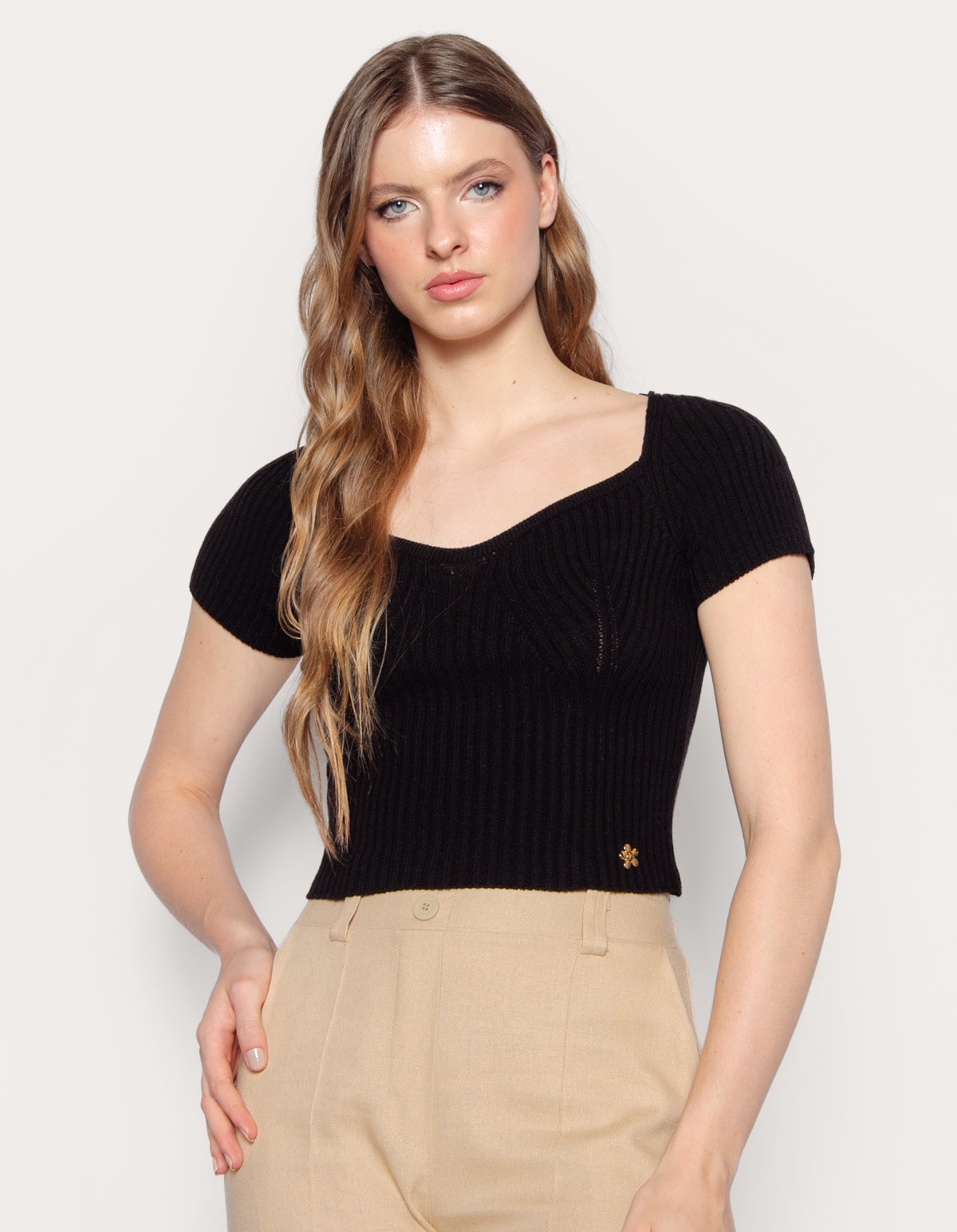 Blusa cropped tricot canelado, modelagem ajustada, decote estilo coração e manga curta princesa. moderna e estilosa, é ideal para diversas ocasiões!