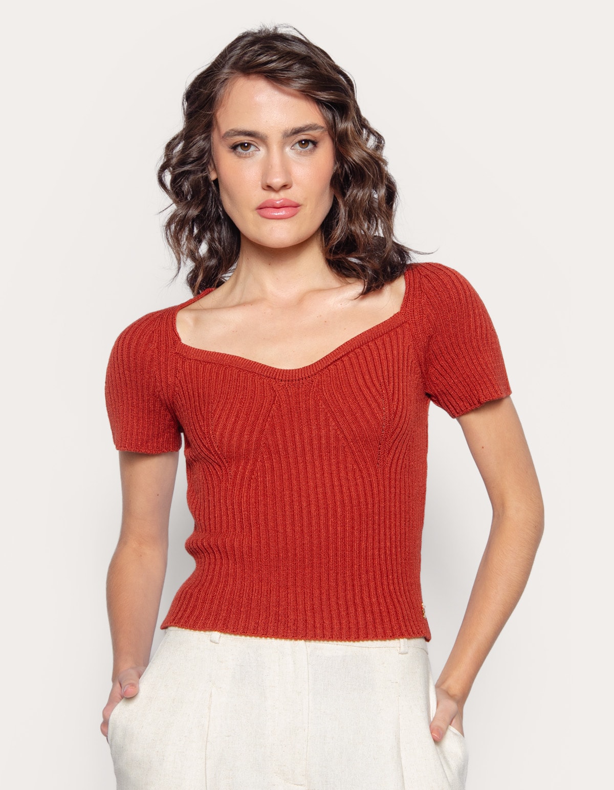 Blusa cropped tricot canelado, modelagem ajustada, decote estilo coração e manga curta princesa. moderna e estilosa, é ideal para diversas ocasiões!