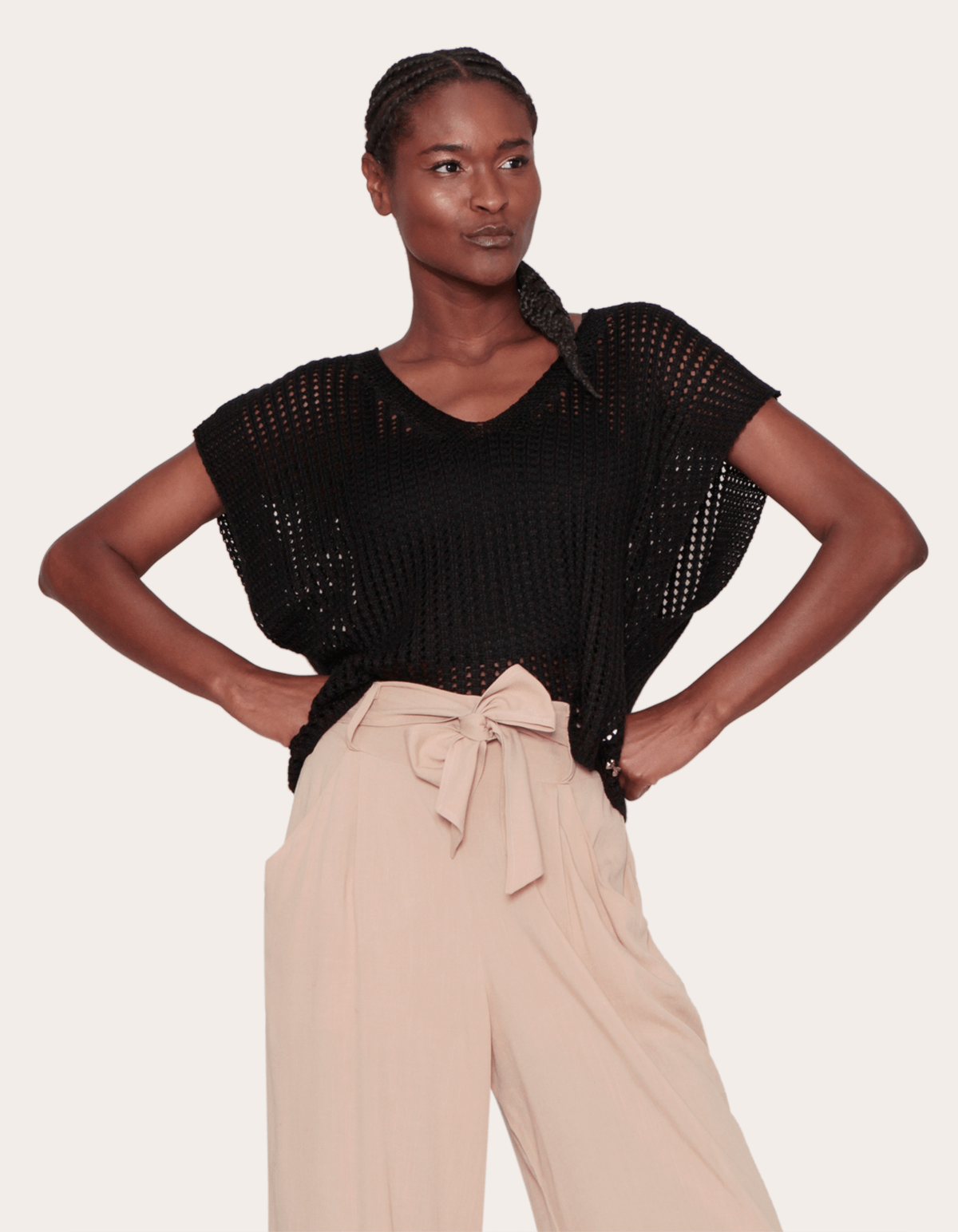 Blusa tricot ponto mais aberto, cavada, decote v, possui modelagem mais soltinha. ótima opção para usar no dia a dia pois possui toque macio e confortável.