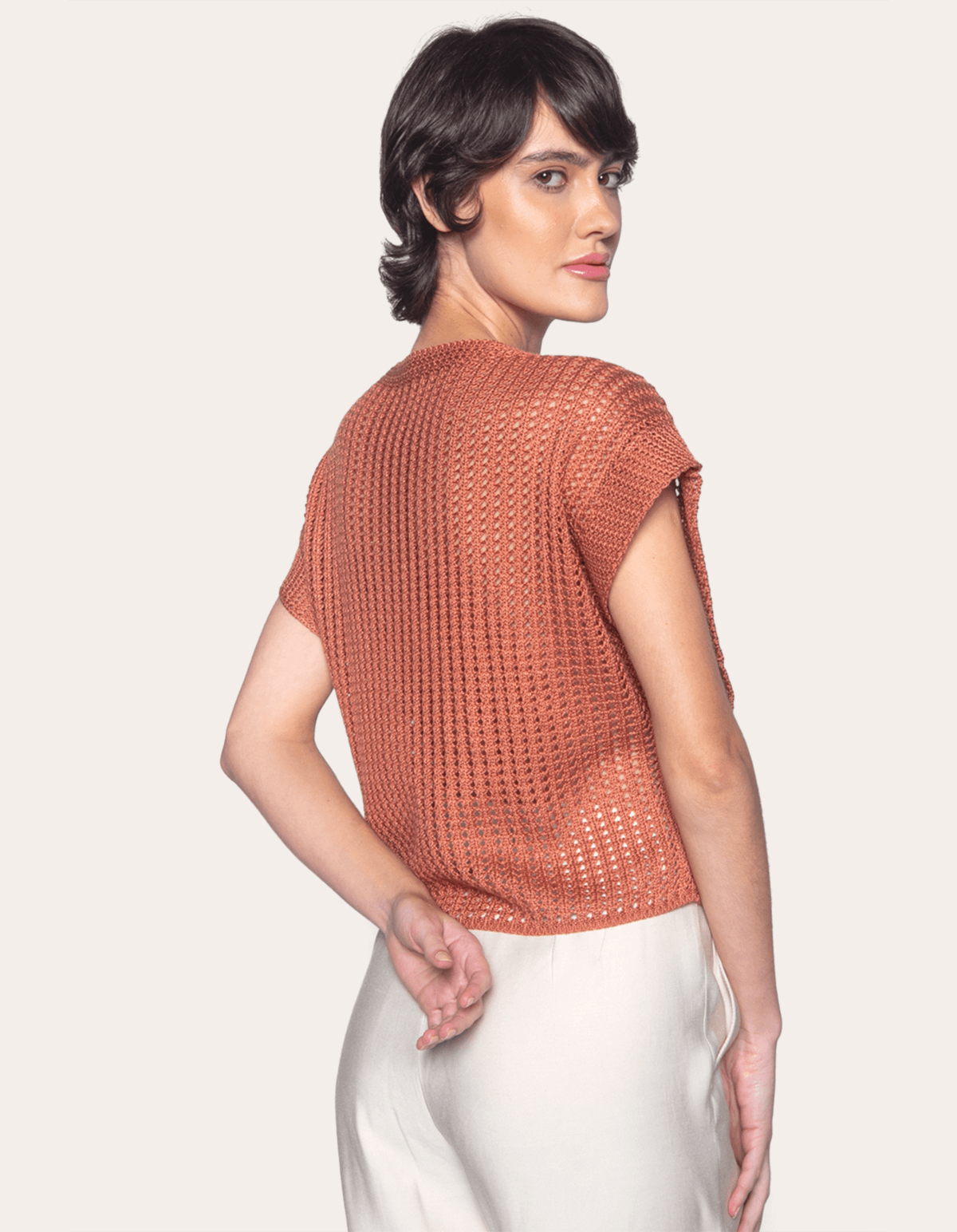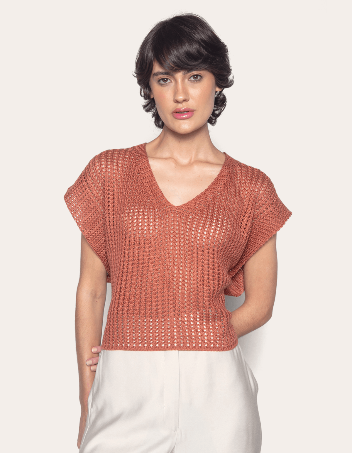 Blusa tricot ponto mais aberto, cavada, decote v, possui modelagem mais soltinha. ótima opção para usar no dia a dia pois possui toque macio e confortável.