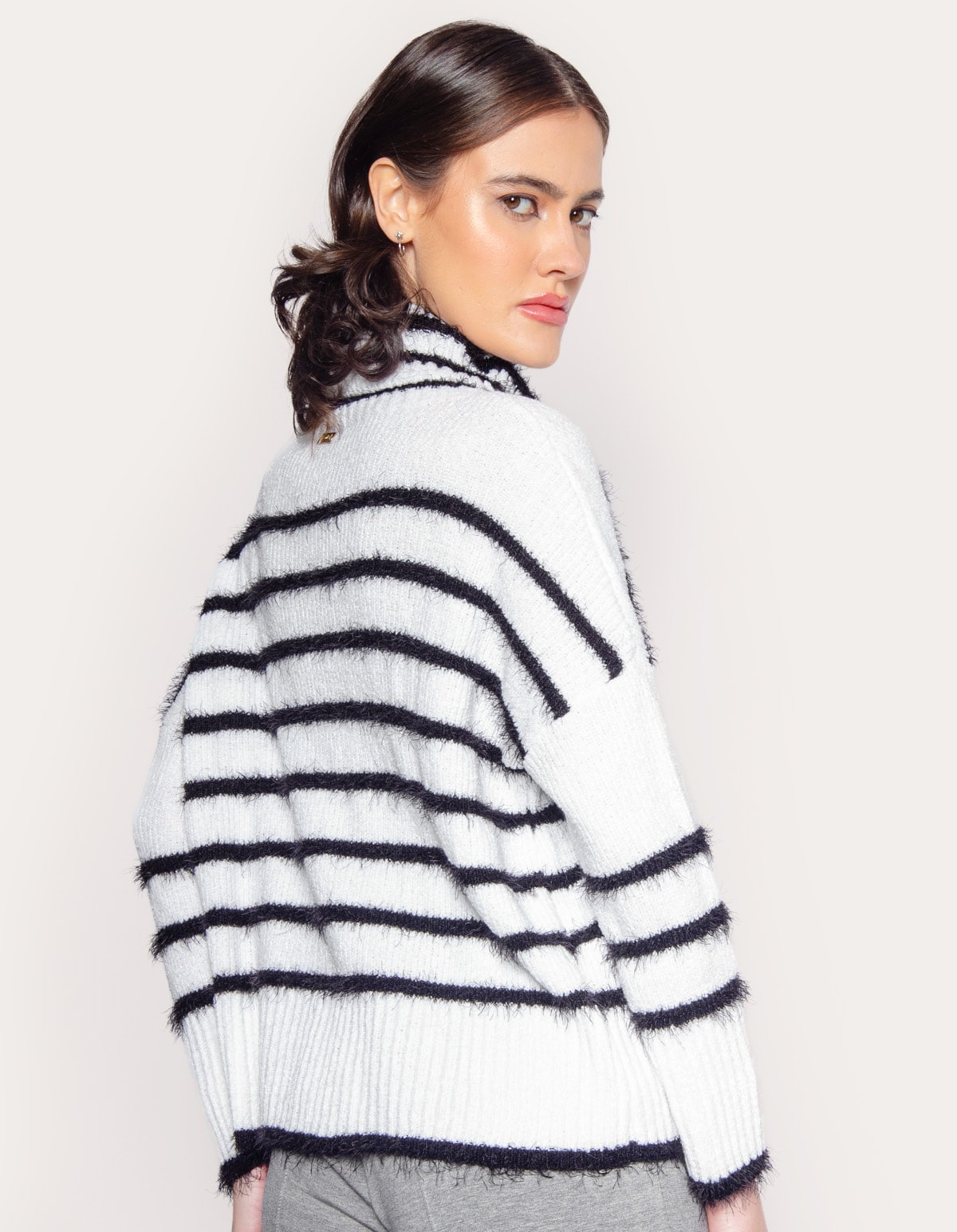 Para curtir os dias frios com muito estilo, a blusa de tricot listrada com pelinho transforma seu look casual em algo sofisticado e confortável, oferecendo um toque macio e delicado à pele.