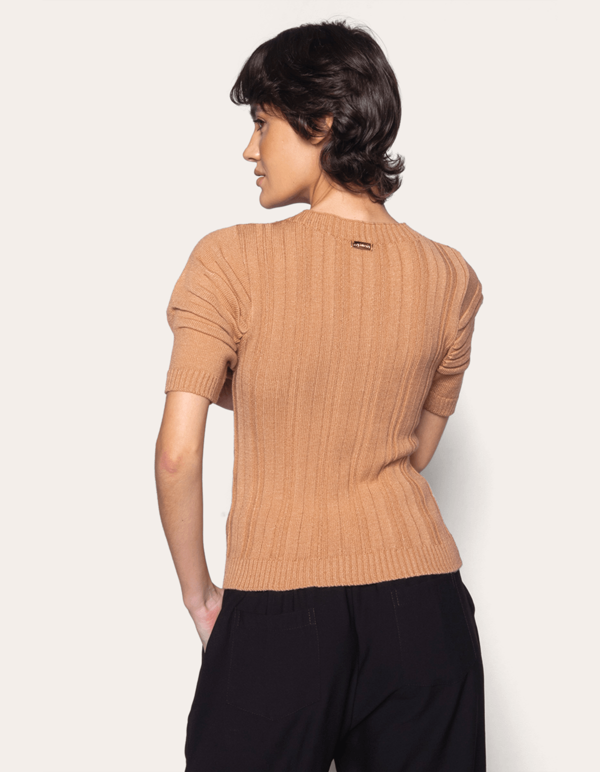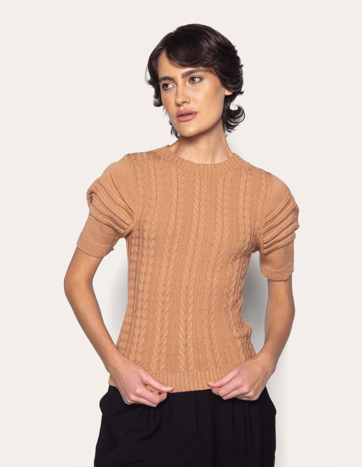 Blusa tricot ponto trança e mang curta plissada. modelo perfeito para mulheres que buscam estilo e conforto.