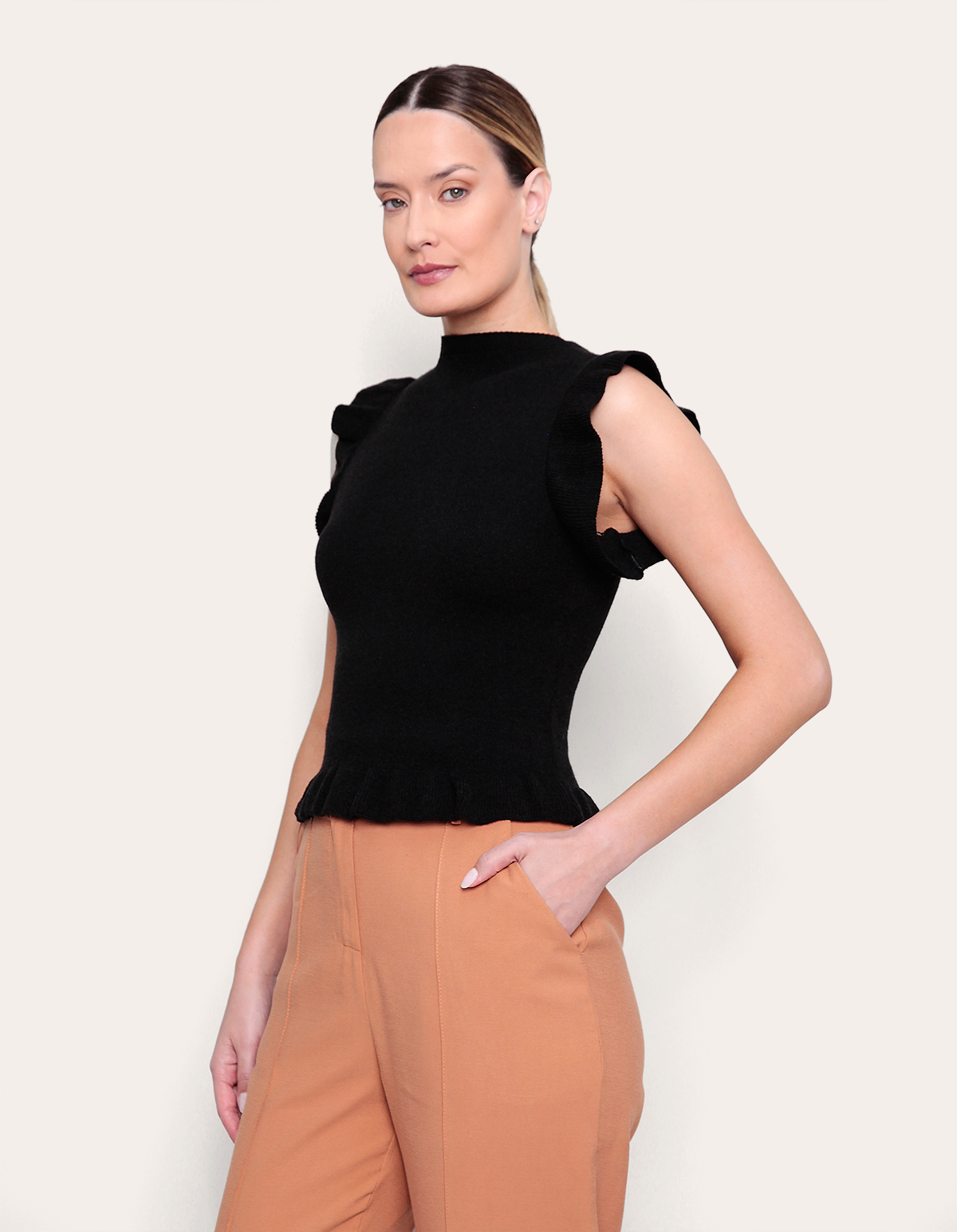 Blusa de tricot com manga de babados, perfeita para um look casual elegante. o design clássico e sofisticado se destaca, garantindo versatilidade e estilo. esse tricot tem uma composição diferenciada de poliester, o pbt que é uma junção de duas fibras e se caracteriza principalmente pela boa resistência contra desgaste, deformação e impacto, tornando sua peça muito mais bonita.