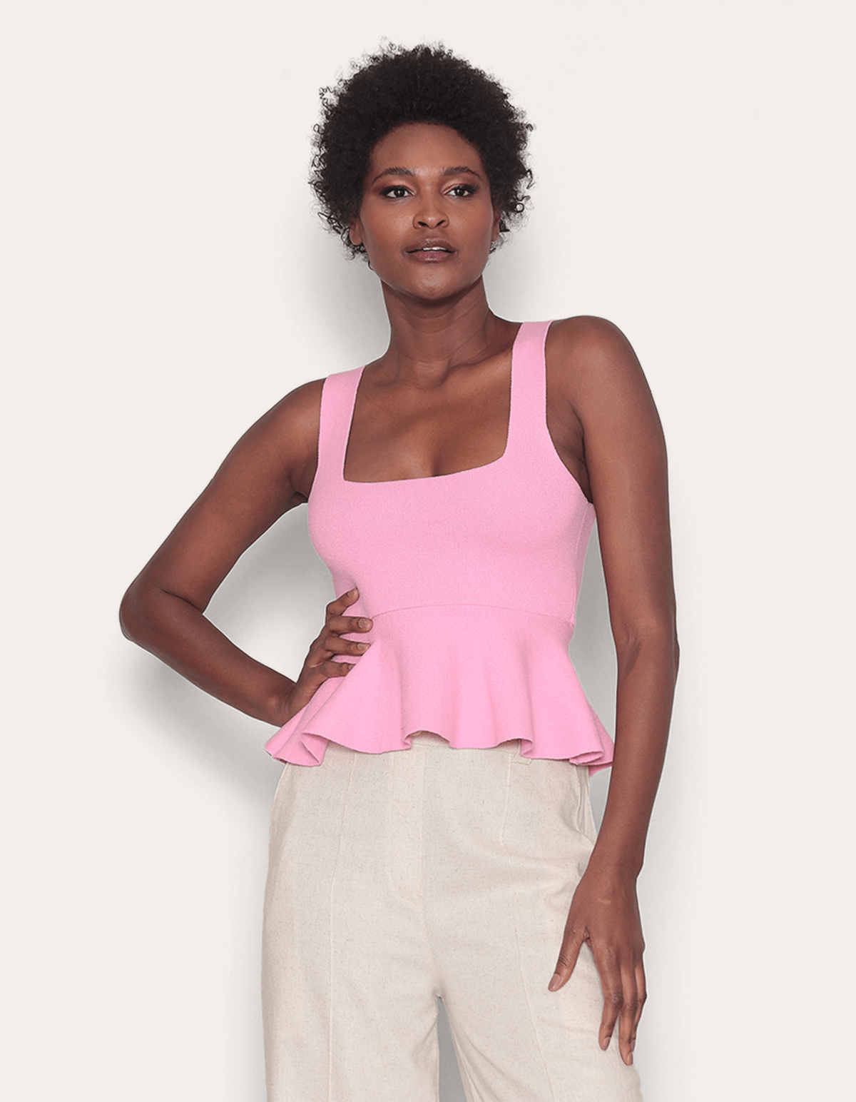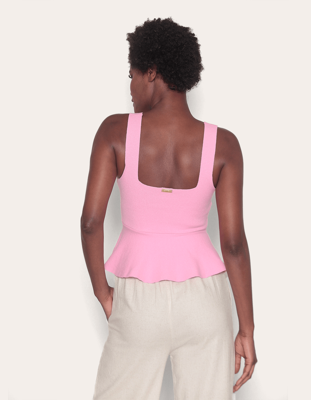 Blusa feminina confeccionada em tricot, com decote quadrado e alças largas. possui recorte na cintura com babado, de modelo peplum que proporciona visualmente a diminuição da cintura e o aumento dos quadris, deixando o look com um ar delicado e jovial.