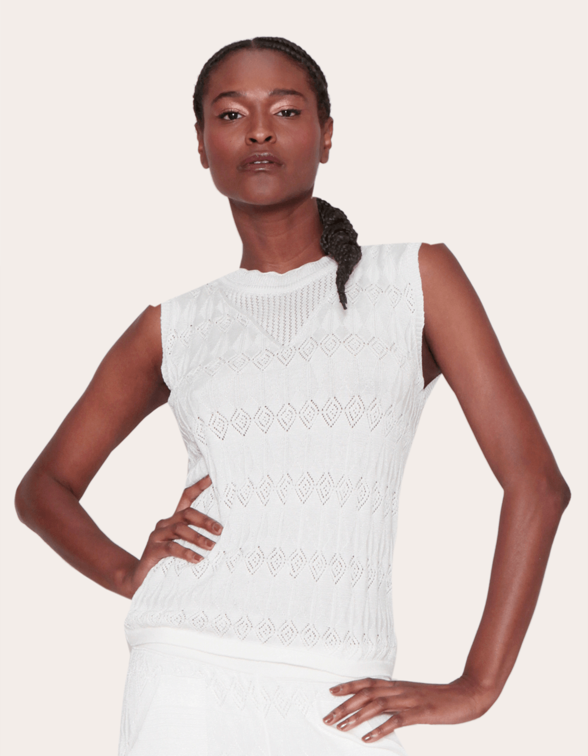 Blusa cavada decote redondo em tricot com desenhos de losangos vazados. modelo versátil e atemporal, sinônimo de conforto e elegância.