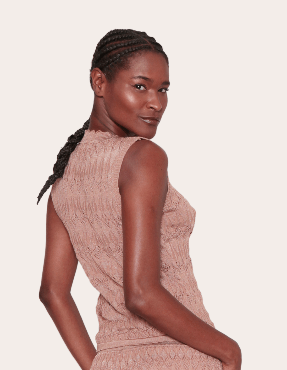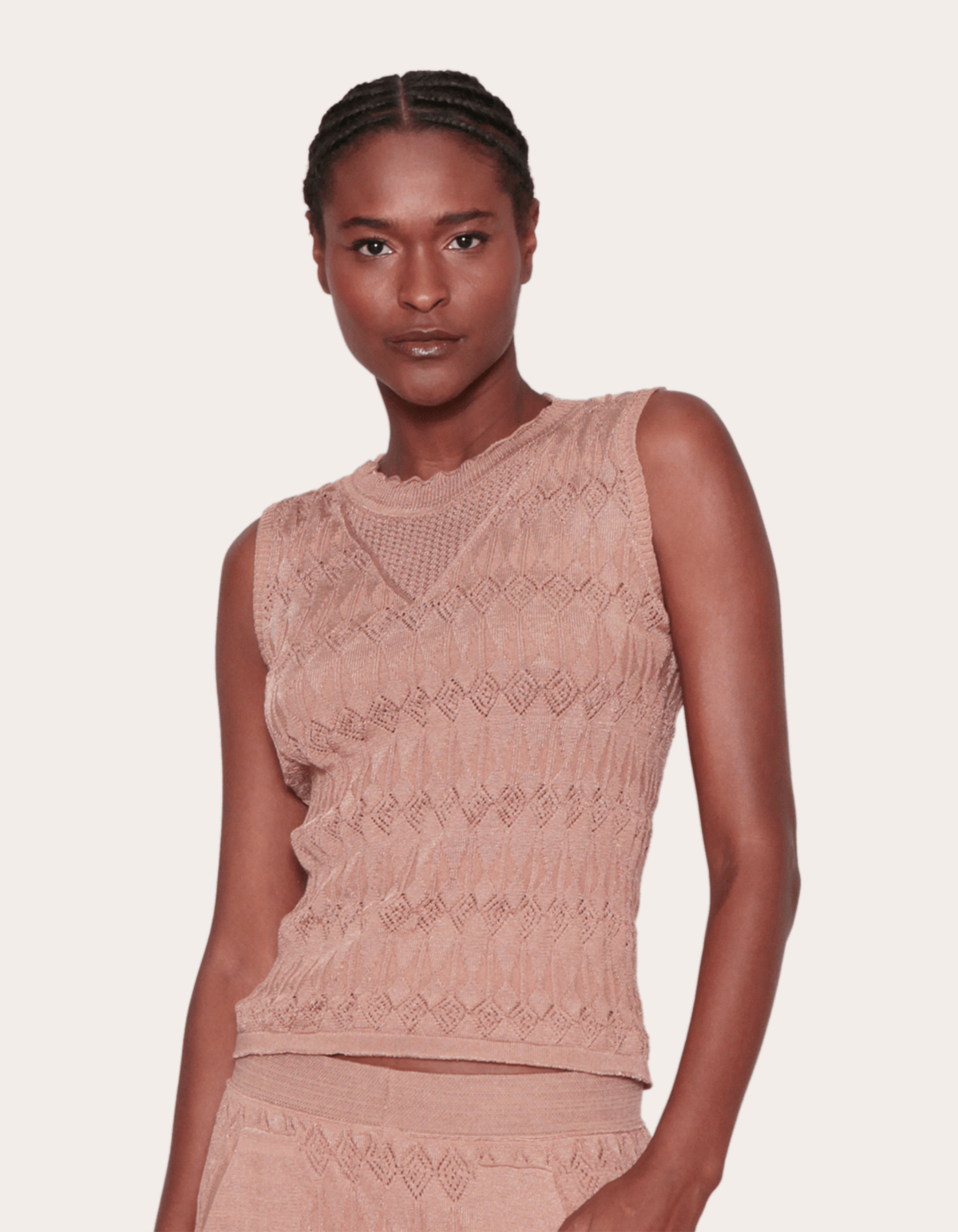 Blusa cavada decote redondo em tricot com desenhos de losangos vazados. modelo versátil e atemporal, sinônimo de conforto e elegância.