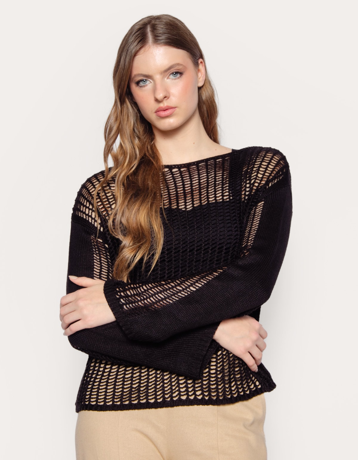 Blusa tricot mnaga longa com tramas abertas tipo tela, decote canoa. ótima opção para usar com peças de cintura alta. aposte!