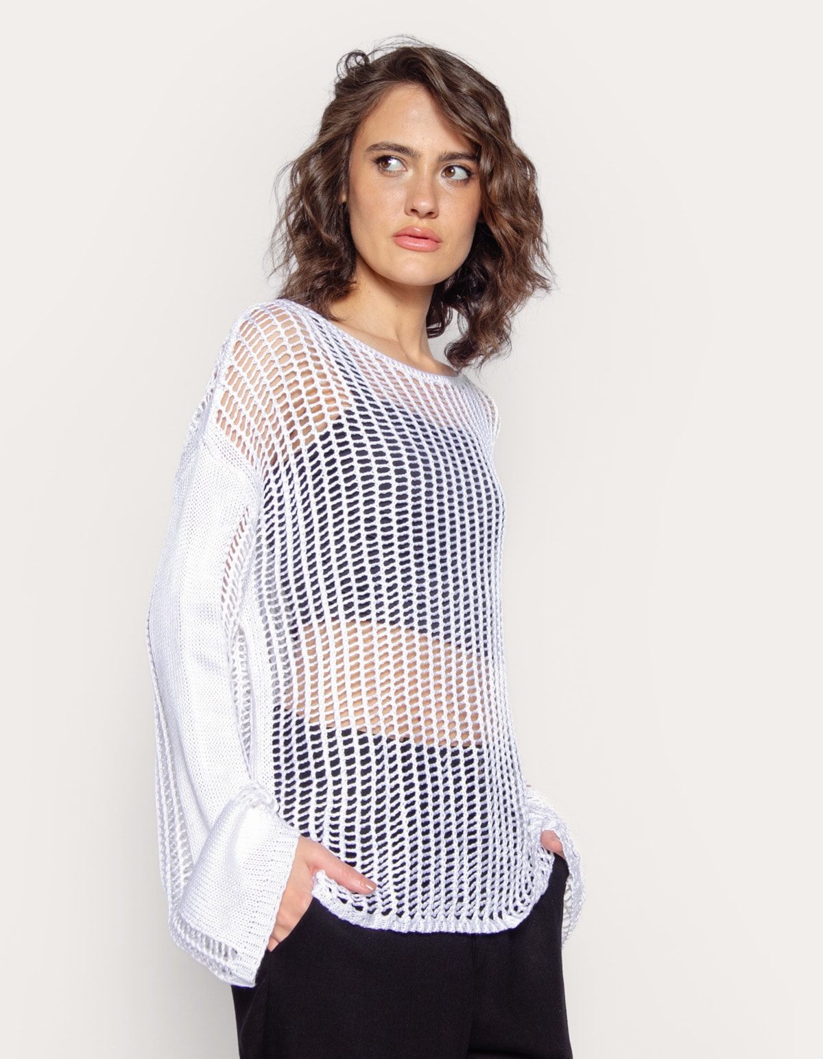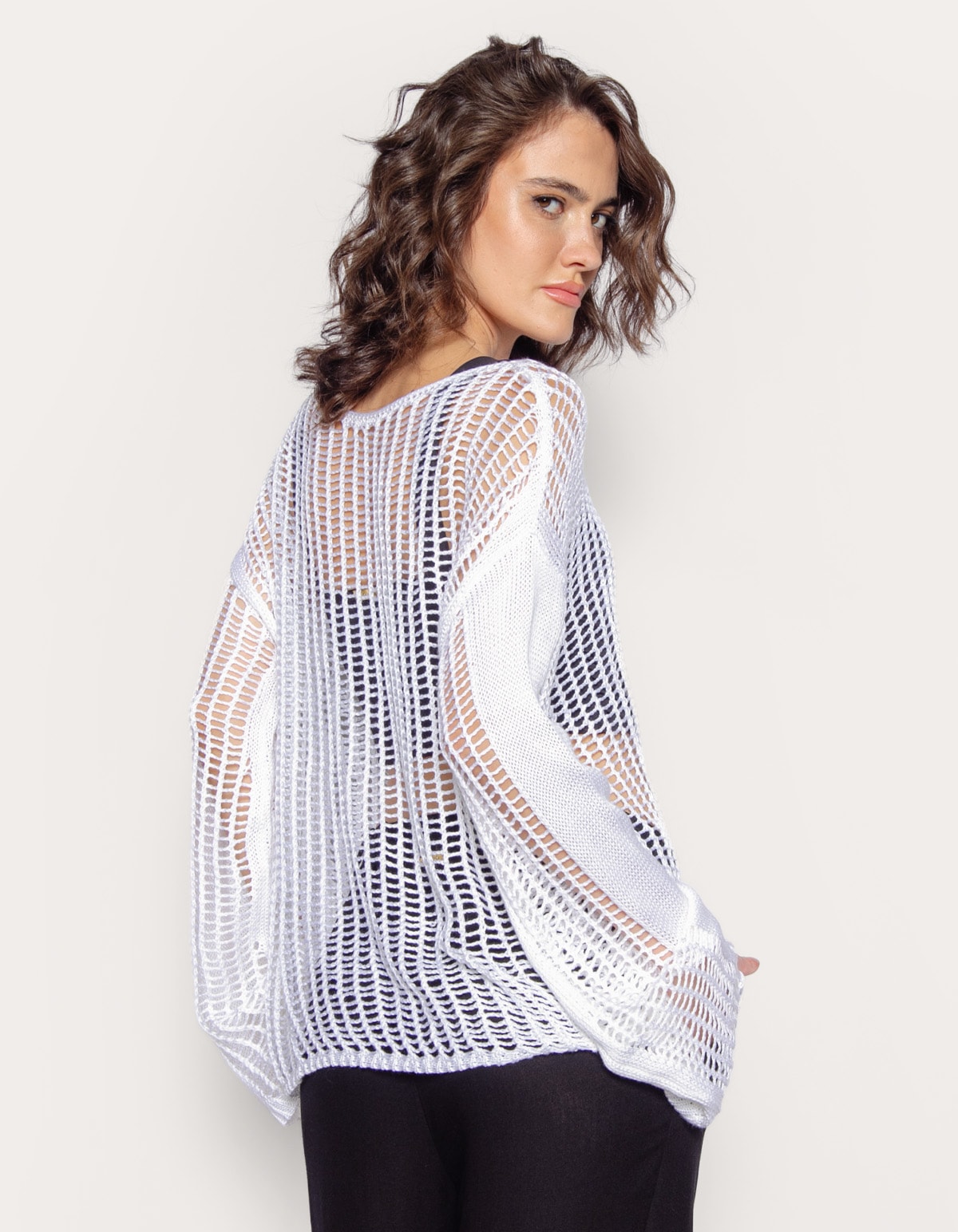Blusa tricot mnaga longa com tramas abertas tipo tela, decote canoa. ótima opção para usar com peças de cintura alta. aposte!