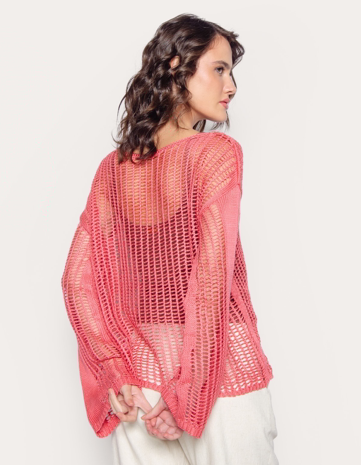Blusa tricot mnaga longa com tramas abertas tipo tela, decote canoa. ótima opção para usar com peças de cintura alta. aposte!