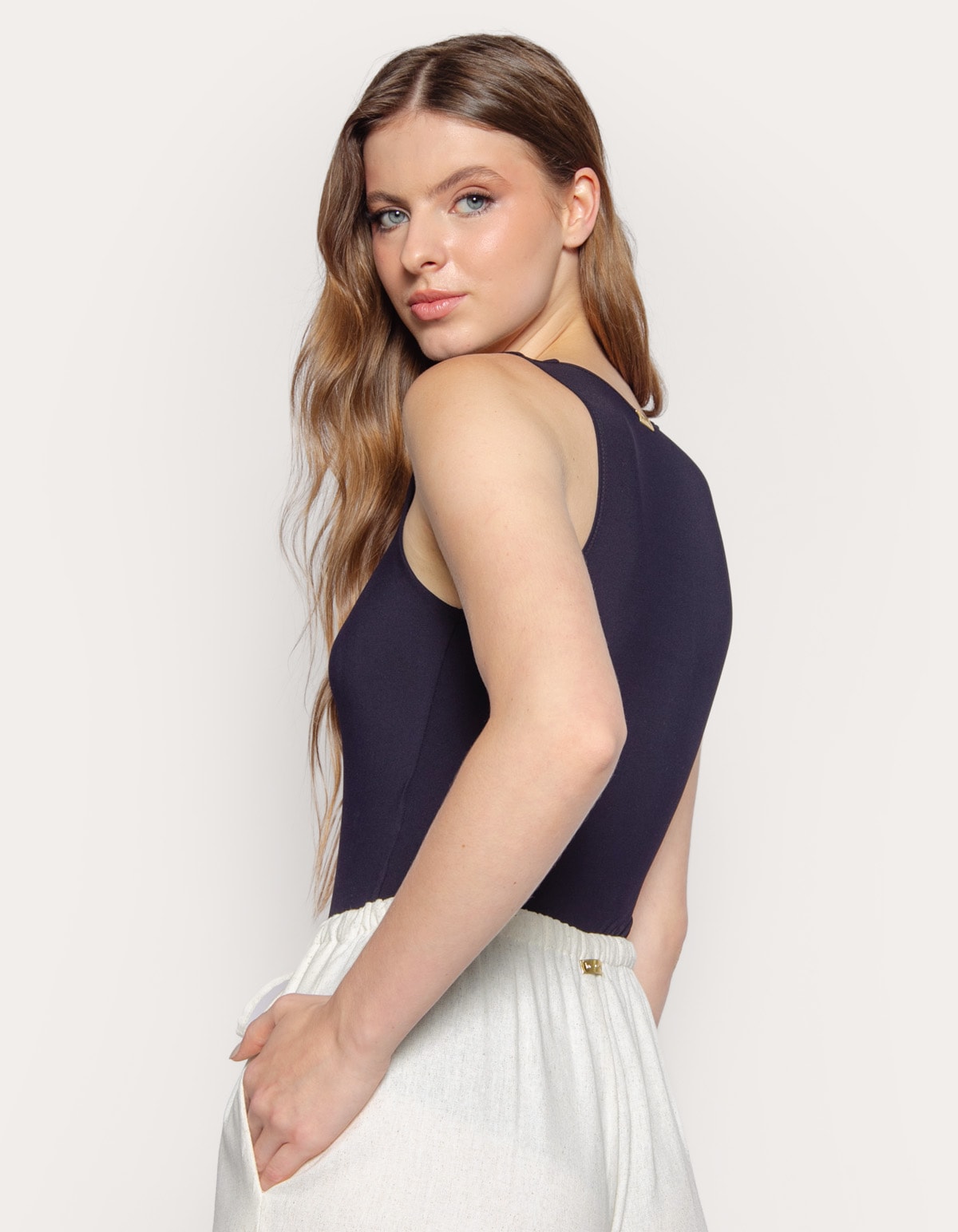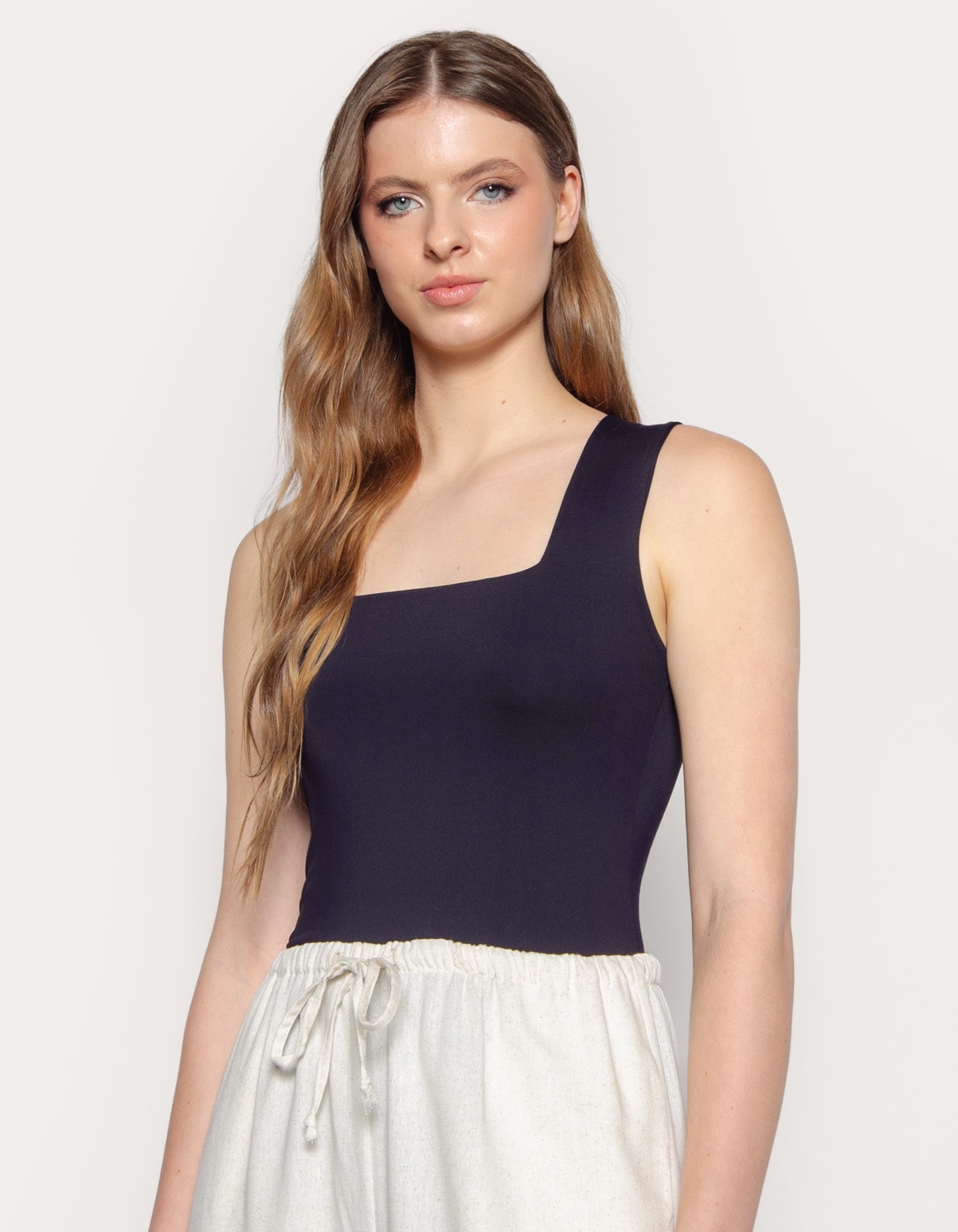 Body decote quadrado, alças largas, modelagem justa. Modelo versátil, minimalista e moderno.
