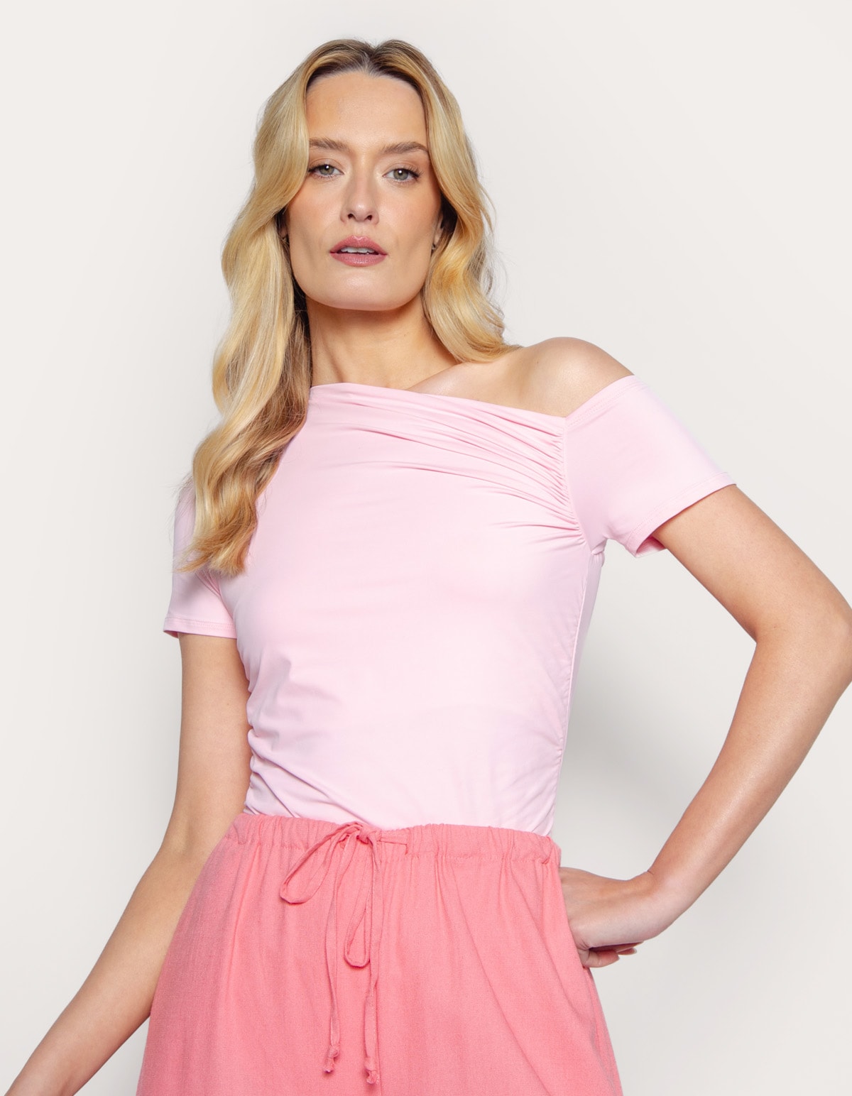 Body manga curta, golinha alta assimetrica drapeada. Moderno e ousado, com design assimétrico e rico em drapeados.