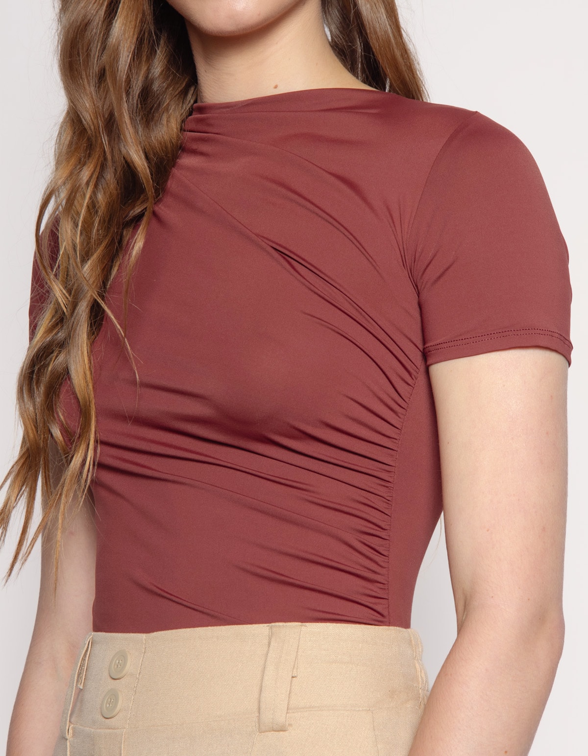 Body manga curta, golinha alta drapeada. Versátil, minimalista e moderno.