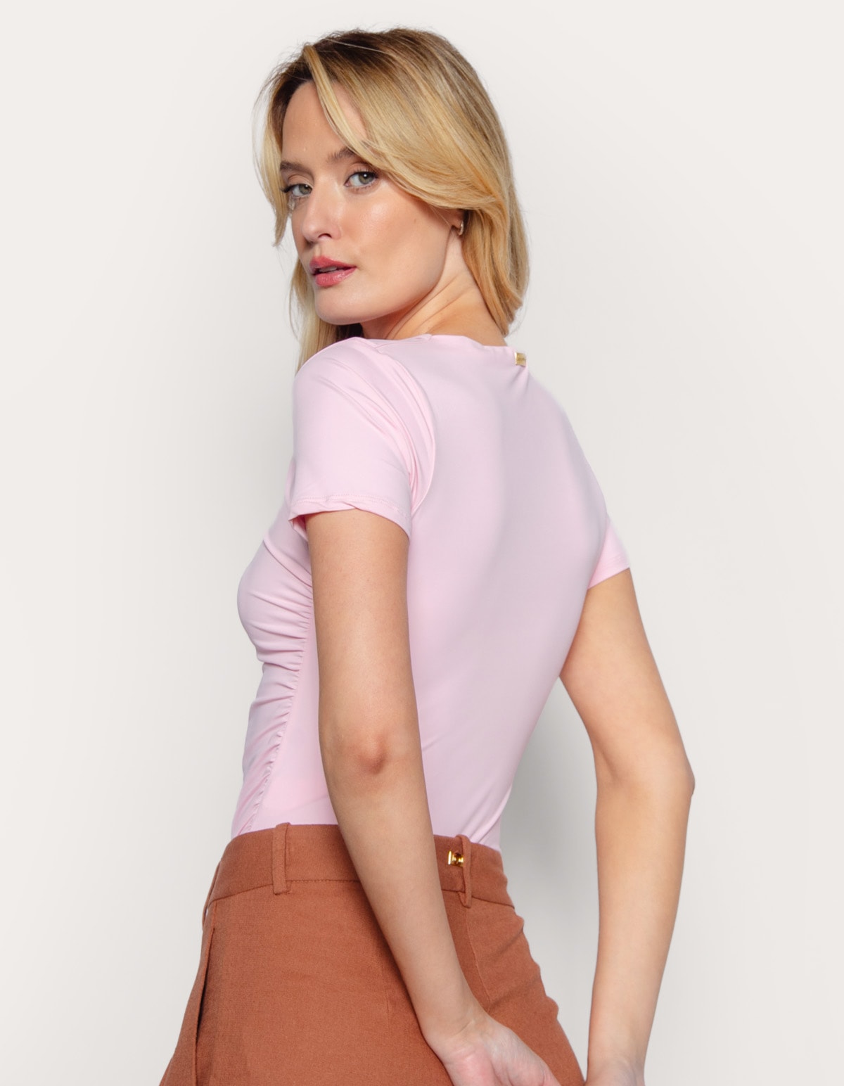 Body manga curta, golinha alta drapeada. Versátil, minimalista e moderno.