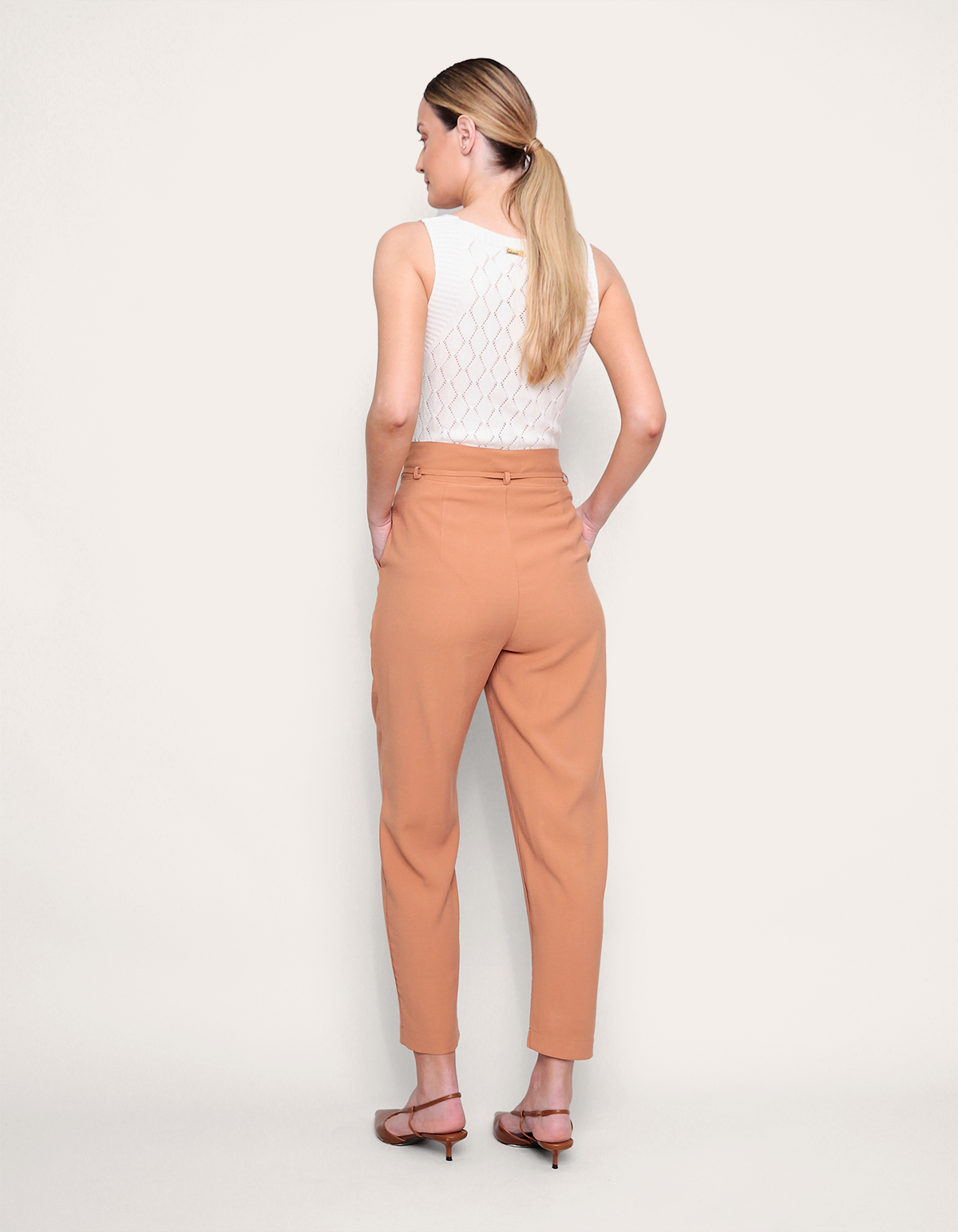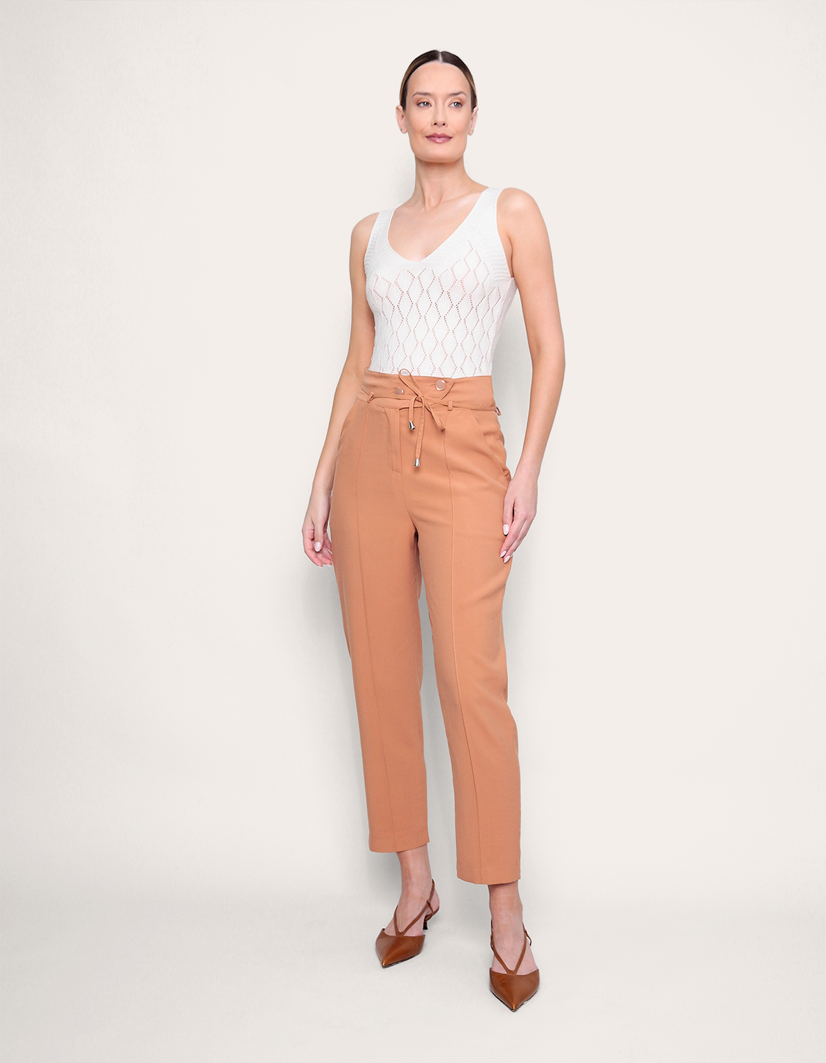 Calça confeccionada em tecido plano, modelo alfaiataria, caimento reto, cintura alta com fechamento em botões e zíper, bolso faca dos dois lados nas laterais. possui faixa para amarração com ponteira. opção perfeita para criar looks sofisticados para o dia a dia.