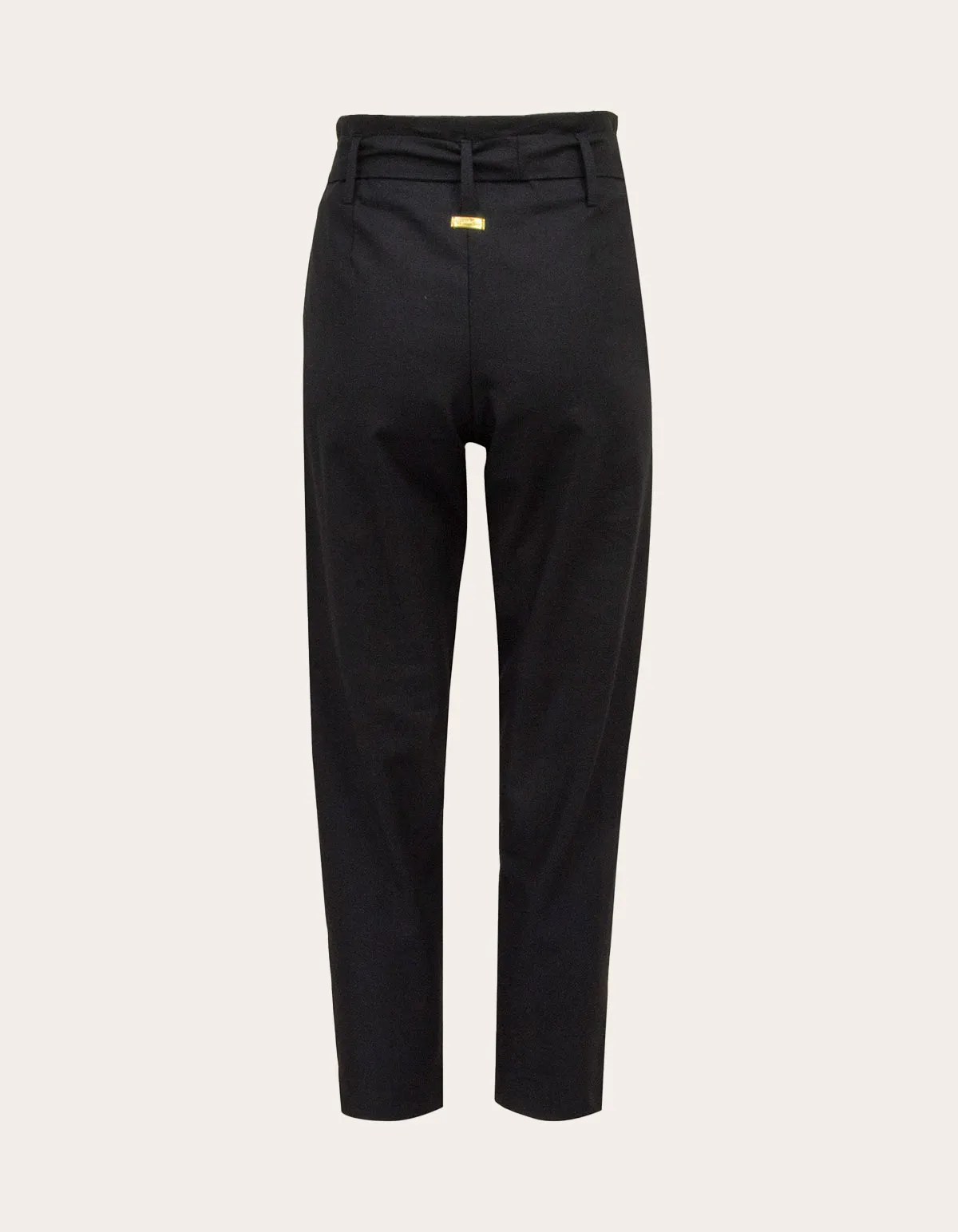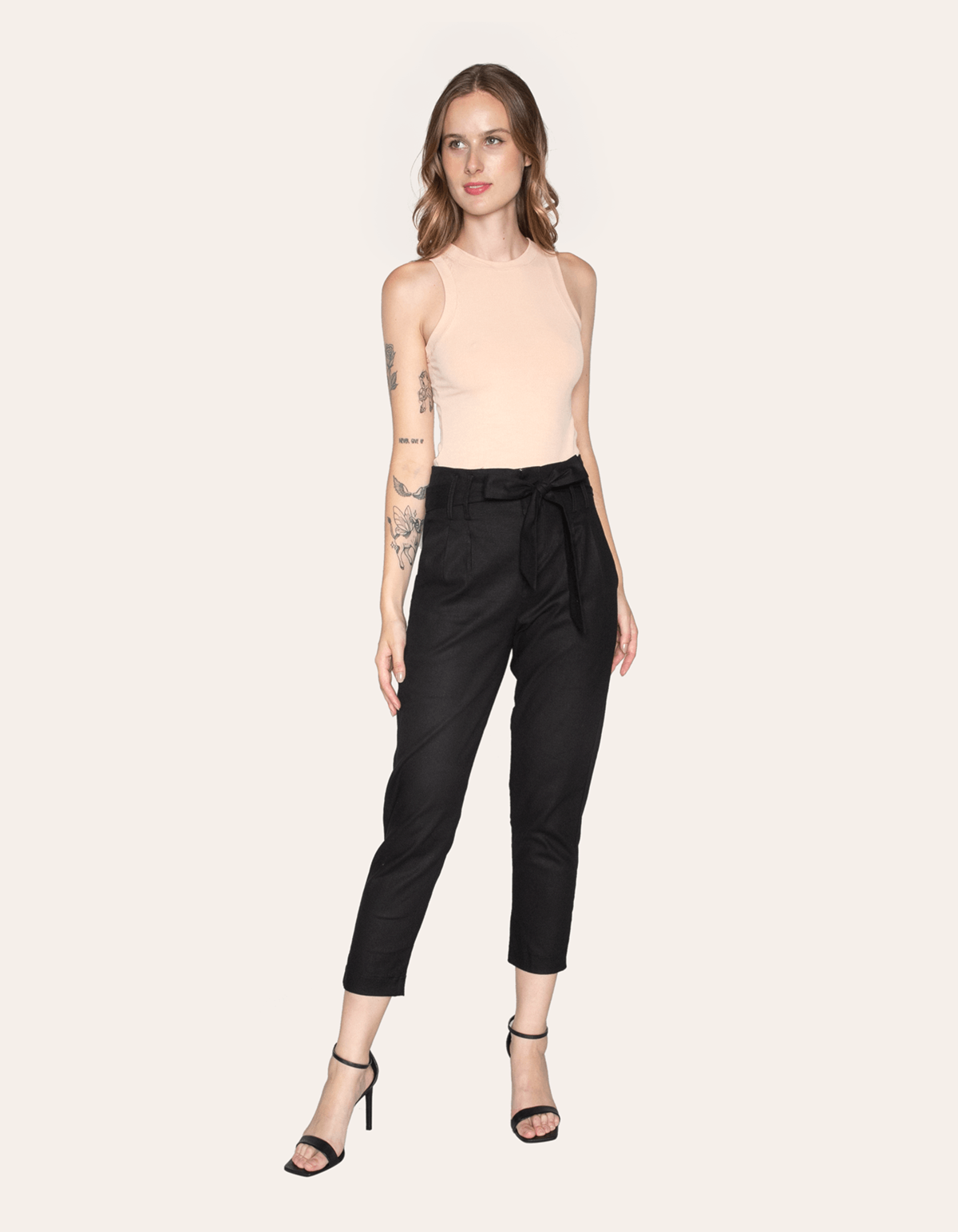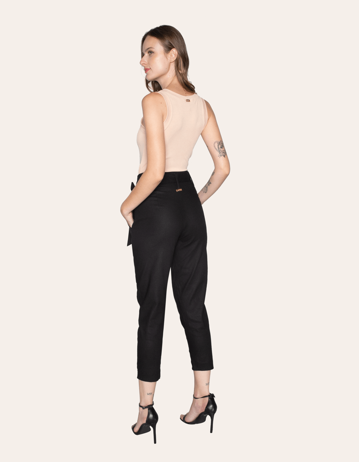 Apresentamos uma calça clochard de cintura alta com cós e passantes, complementada por bolsos frontais e uma faixa para amarração na cintura. esta peça equilibra estilo e funcionalidade, oferecendo um visual moderno e confortável para diversas ocasiões.