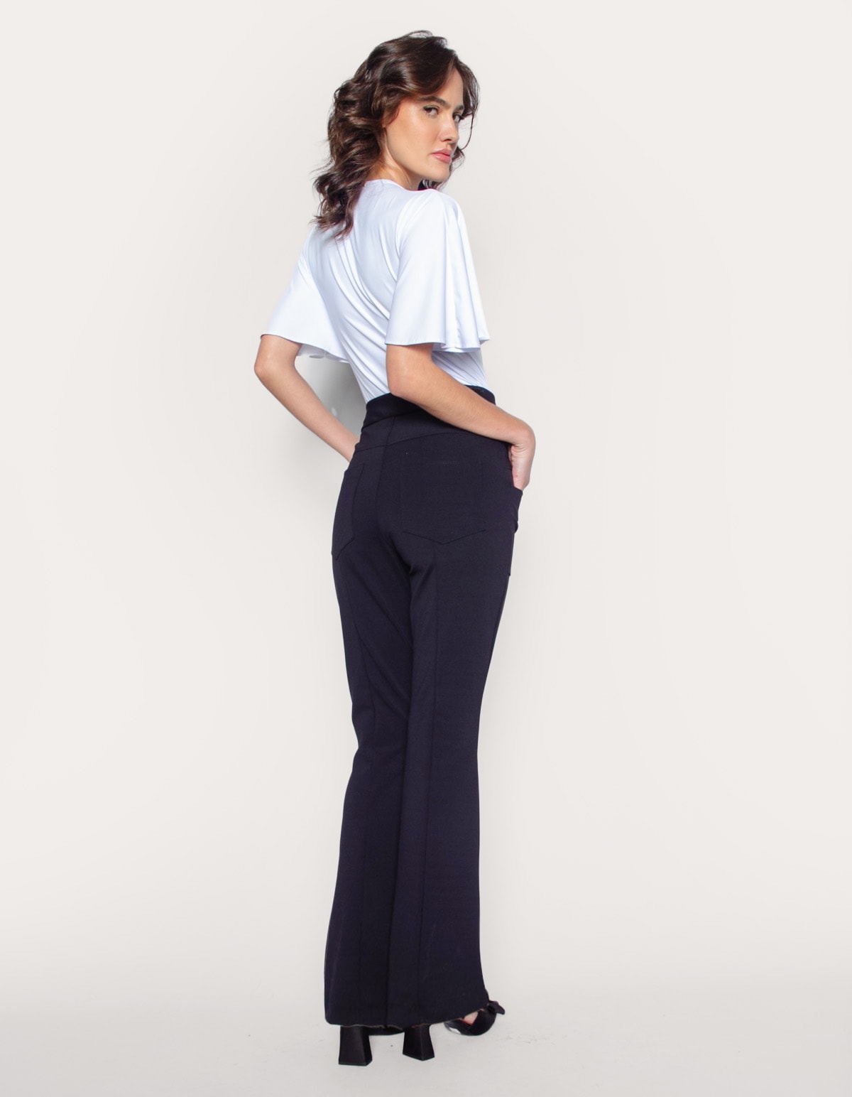 Calça flare, cintura alta de cós largo, fechamento por botão único, grande e dourado e ziper frontal. A calça tem um corte justo na região da coxa e quadril modelando o corpo e da altura do joelho para baixo, o tecido se abre em uma boca de sino (flare). Com bolsos na frente localizados logo abaixo do cós em malha de poliamida com elastano que confere caimento e elasticidade ajustando a silhueta. Uma peça moderna que combina tendência que alonga a silhueta com o estilo retrô e elegante da boca de sino. Modelo versátil pode ser combinada com uma variedade de tops e calçados, dependendo da formalidade do evento.