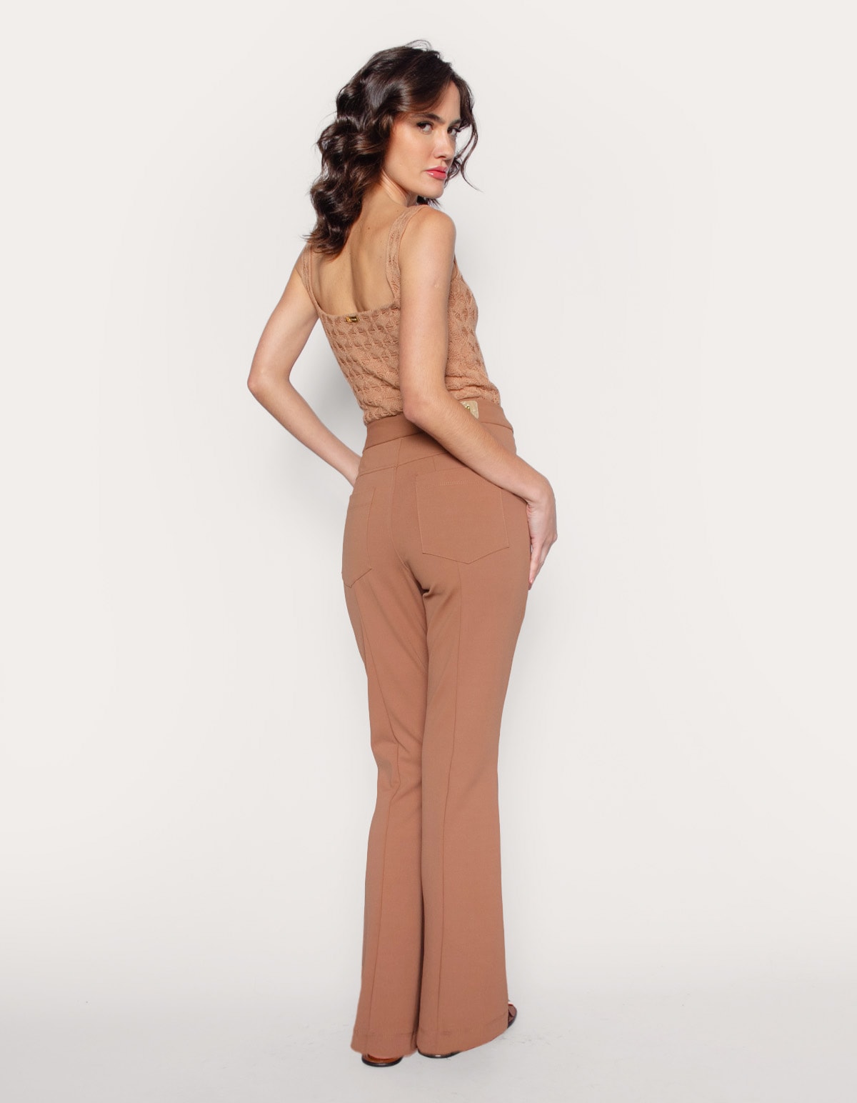 Calça flare, cintura alta de cós largo, fechamento por botão único, grande e dourado e ziper frontal. A calça tem um corte justo na região da coxa e quadril modelando o corpo e da altura do joelho para baixo, o tecido se abre em uma boca de sino (flare). Com bolsos na frente localizados logo abaixo do cós em malha de poliamida com elastano que confere caimento e elasticidade ajustando a silhueta. Uma peça moderna que combina tendência que alonga a silhueta com o estilo retrô e elegante da boca de sino. Modelo versátil pode ser combinada com uma variedade de tops e calçados, dependendo da formalidade do evento.