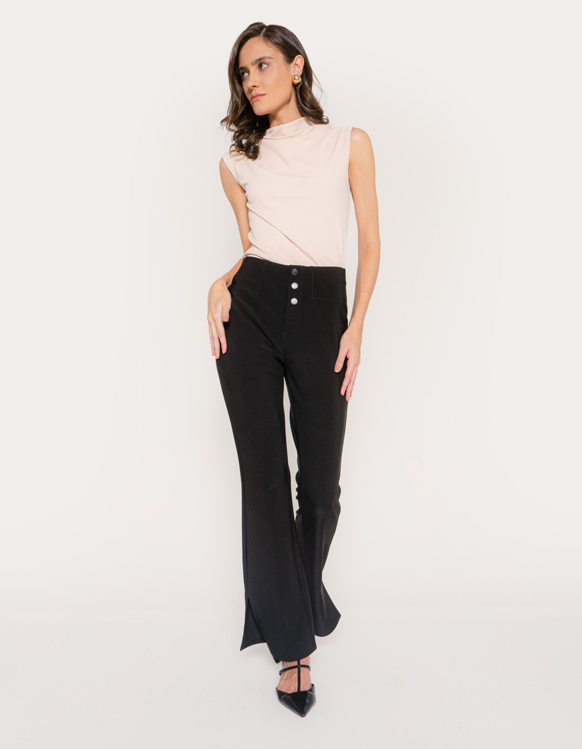 Modelagem Inteligente: Cintura alta e corte flare que alongam visualmente as pernas.