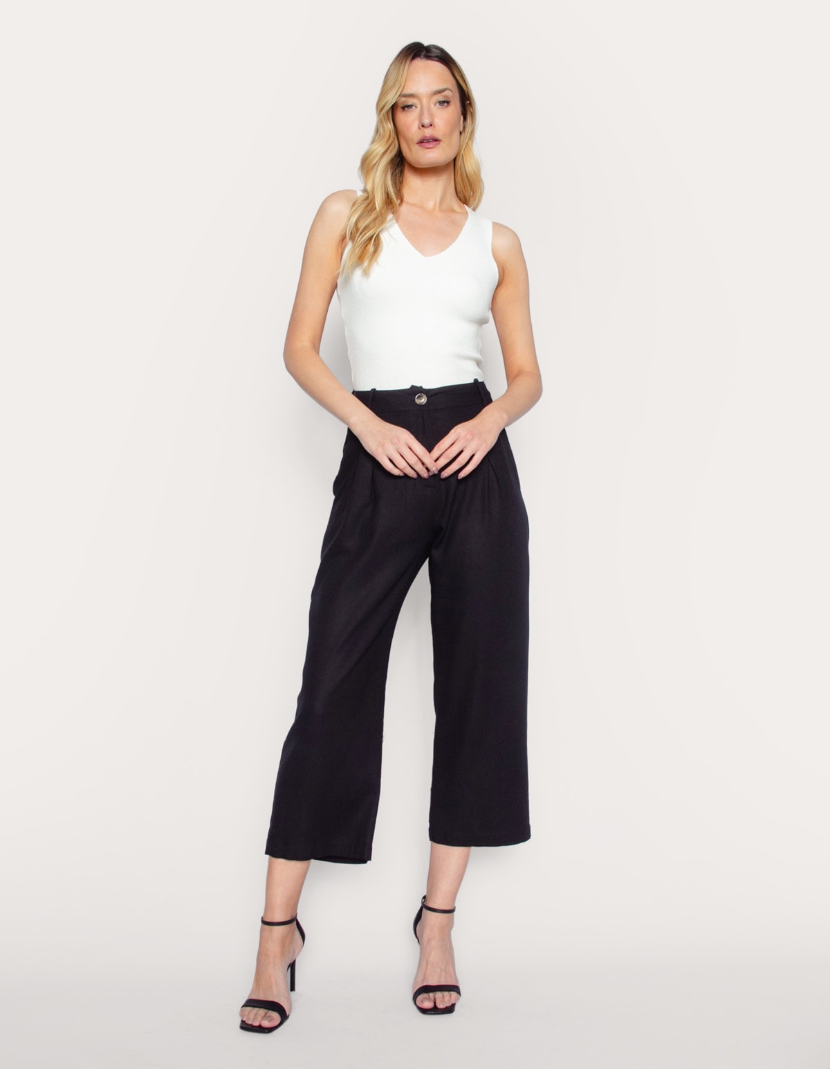 Calça pantacourt cintura alta. De corte solto e fluido, em linho blend. Fechamento frontal por botão e zíper, possui pregas na cintura que adicionam um elemento de alfaiataria elegante e ajudam a criar o volume e o caimento solto nas pernas. Ideal para looks que variam do casual chique ao social descontraído, dependendo dos acessórios e calçados combinados.