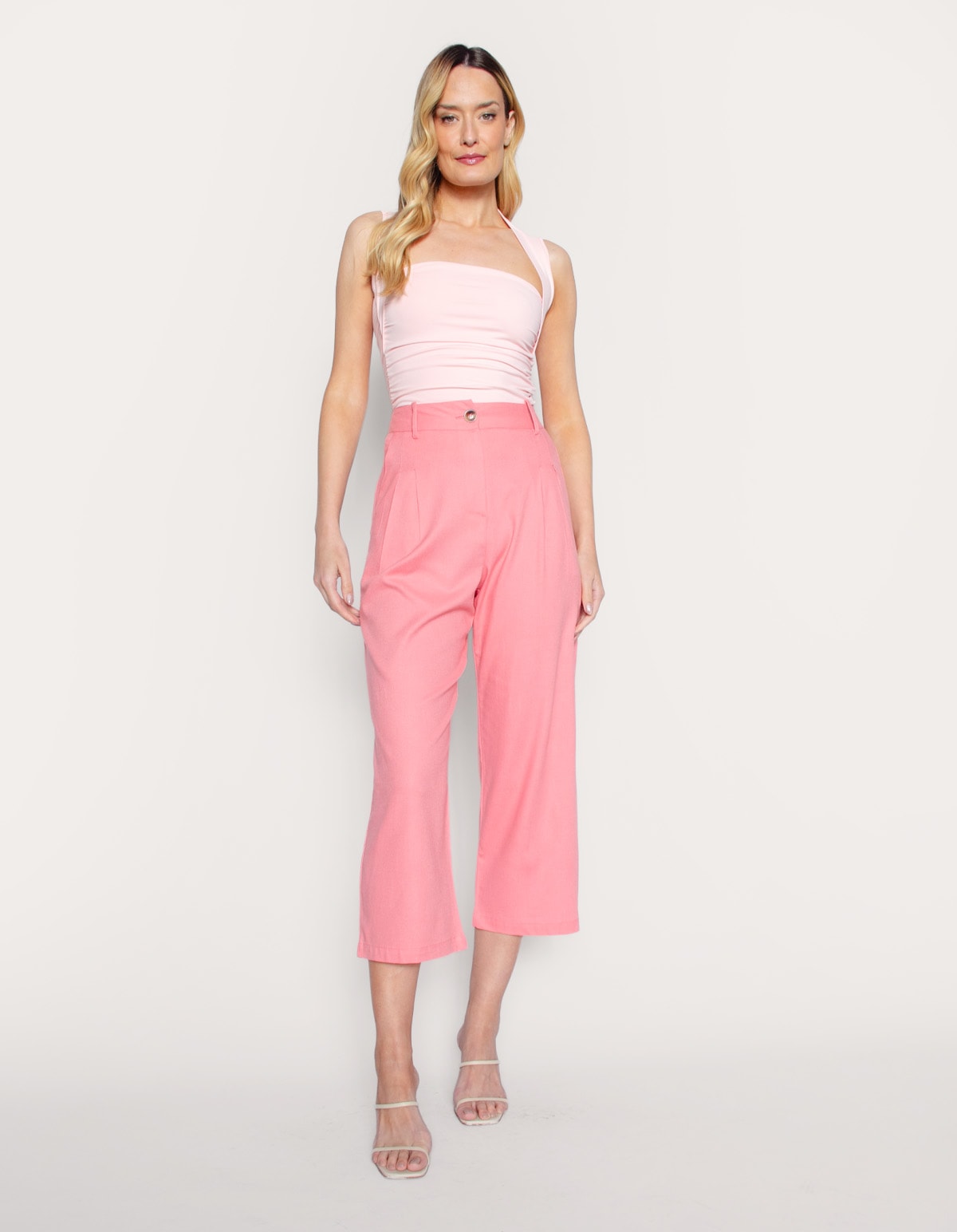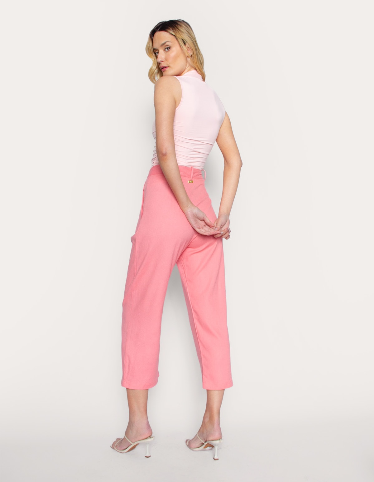 Calça pantacourt cintura alta. De corte solto e fluido, em linho blend. Fechamento frontal por botão e zíper, possui pregas na cintura que adicionam um elemento de alfaiataria elegante e ajudam a criar o volume e o caimento solto nas pernas. Ideal para looks que variam do casual chique ao social descontraído, dependendo dos acessórios e calçados combinados.