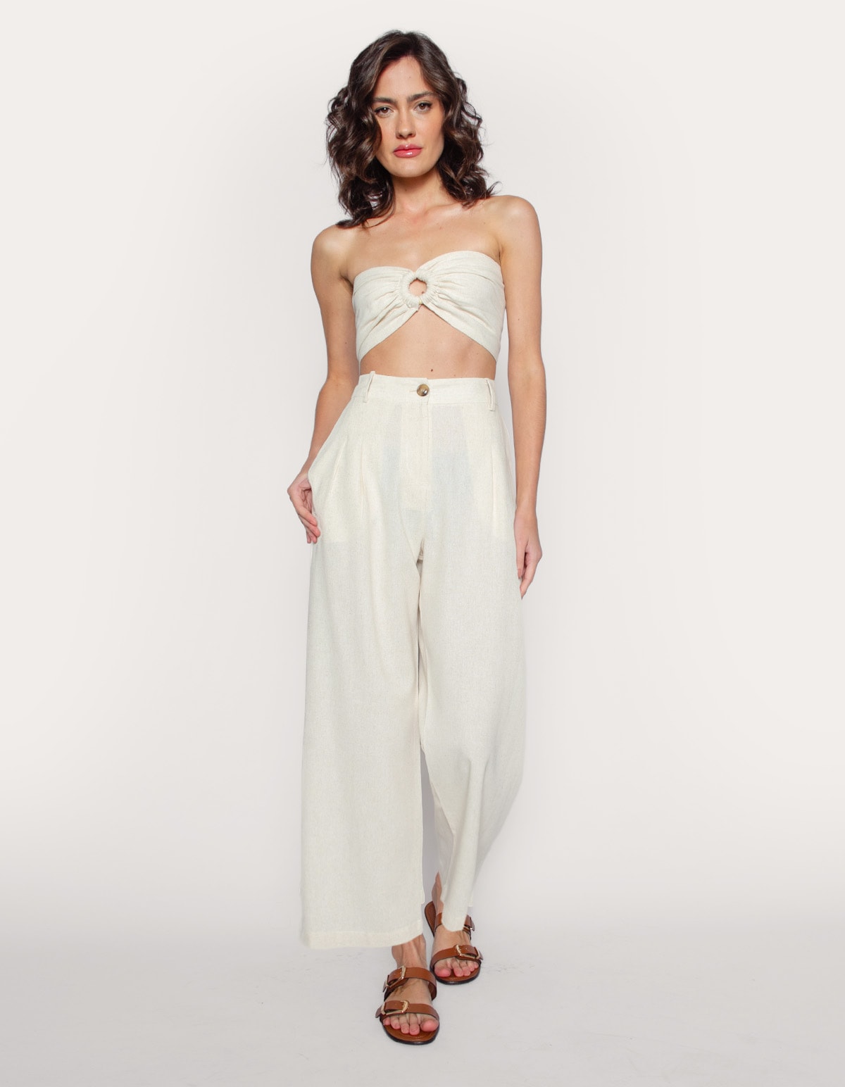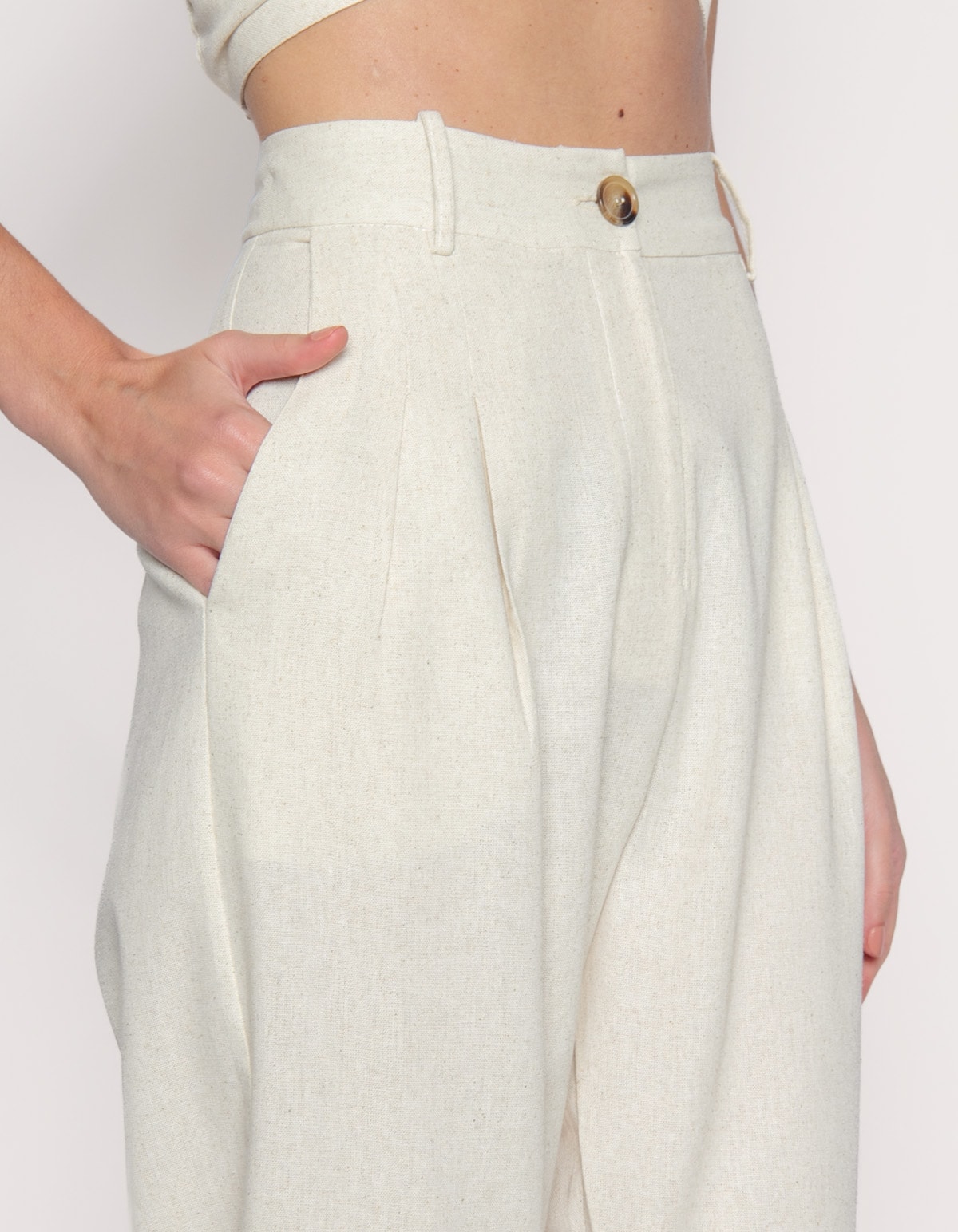 Calça pantacourt cintura alta. De corte solto e fluido, em linho blend. Fechamento frontal por botão e zíper, possui pregas na cintura que adicionam um elemento de alfaiataria elegante e ajudam a criar o volume e o caimento solto nas pernas. Ideal para looks que variam do casual chique ao social descontraído, dependendo dos acessórios e calçados combinados.