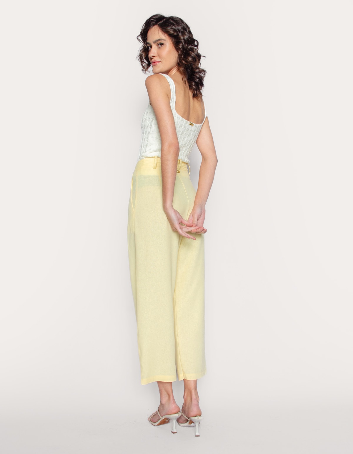 Calça pantacourt cintura alta. De corte solto e fluido, em linho blend. Fechamento frontal por botão e zíper, possui pregas na cintura que adicionam um elemento de alfaiataria elegante e ajudam a criar o volume e o caimento solto nas pernas. Ideal para looks que variam do casual chique ao social descontraído, dependendo dos acessórios e calçados combinados.