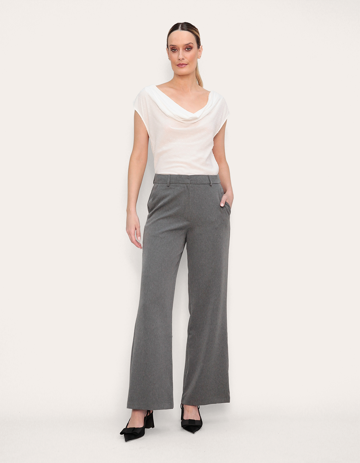 Calça produzida em alfaiataria, um tecido estruturado com caimento elegante. possui cintura alta, cós com passantes aplicados, fechamento frontal por colchetes/botão e zíper fixo, bolsos laterais modelo faca, modelagem pantalona e barra simples. design que valoriza a silhueta, garantindo um caimento impecável.
