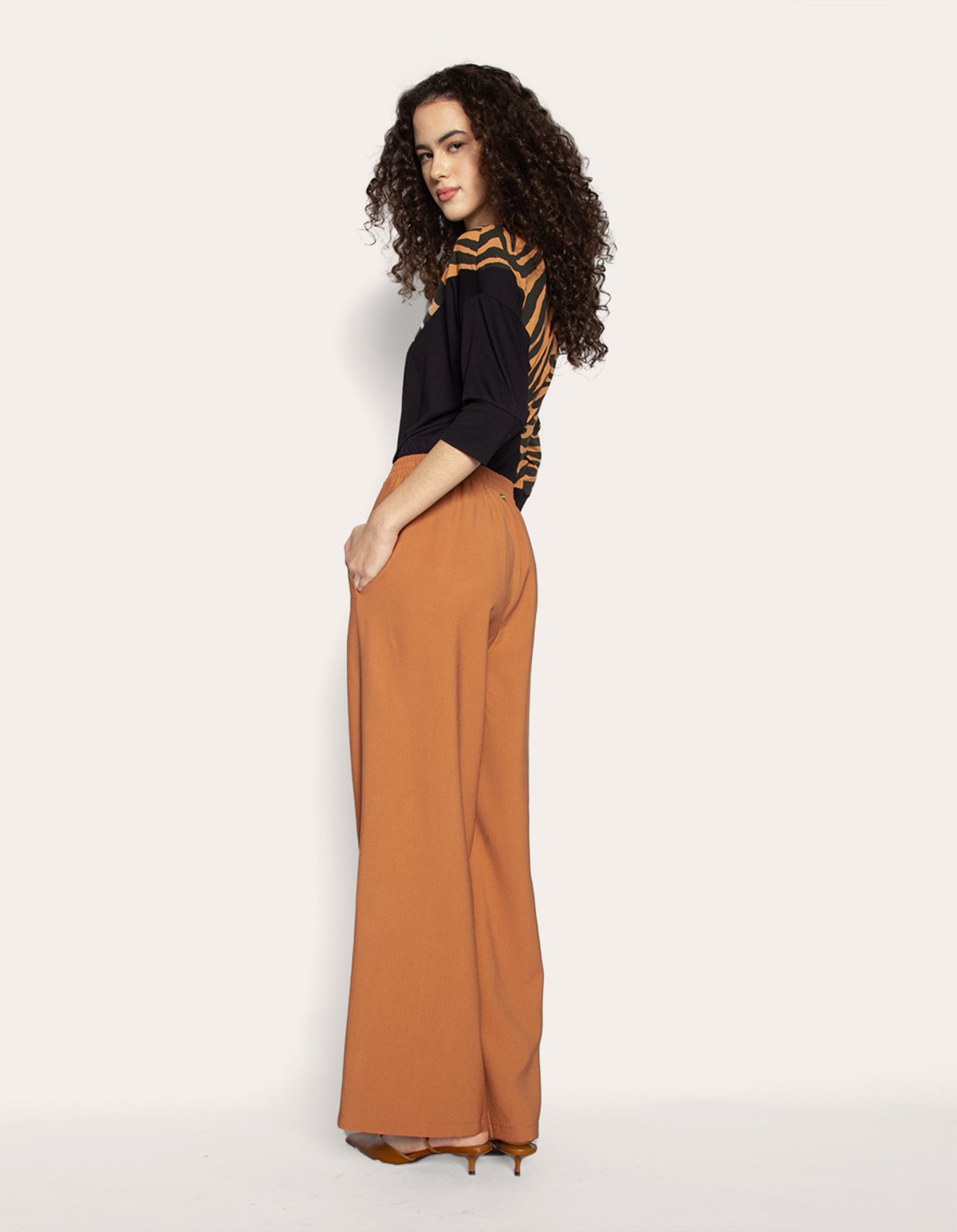 Calça produzida em alfaiataria, um tecido estruturado com caimento elegante. possui cintura alta, fechamento frontal por botão e zíper fixo, bolsos laterais modelo faca, elástico atrás no cós, modelagem pantalona e barra simples. design que valoriza a silhueta, garantindo um caimento impecável.