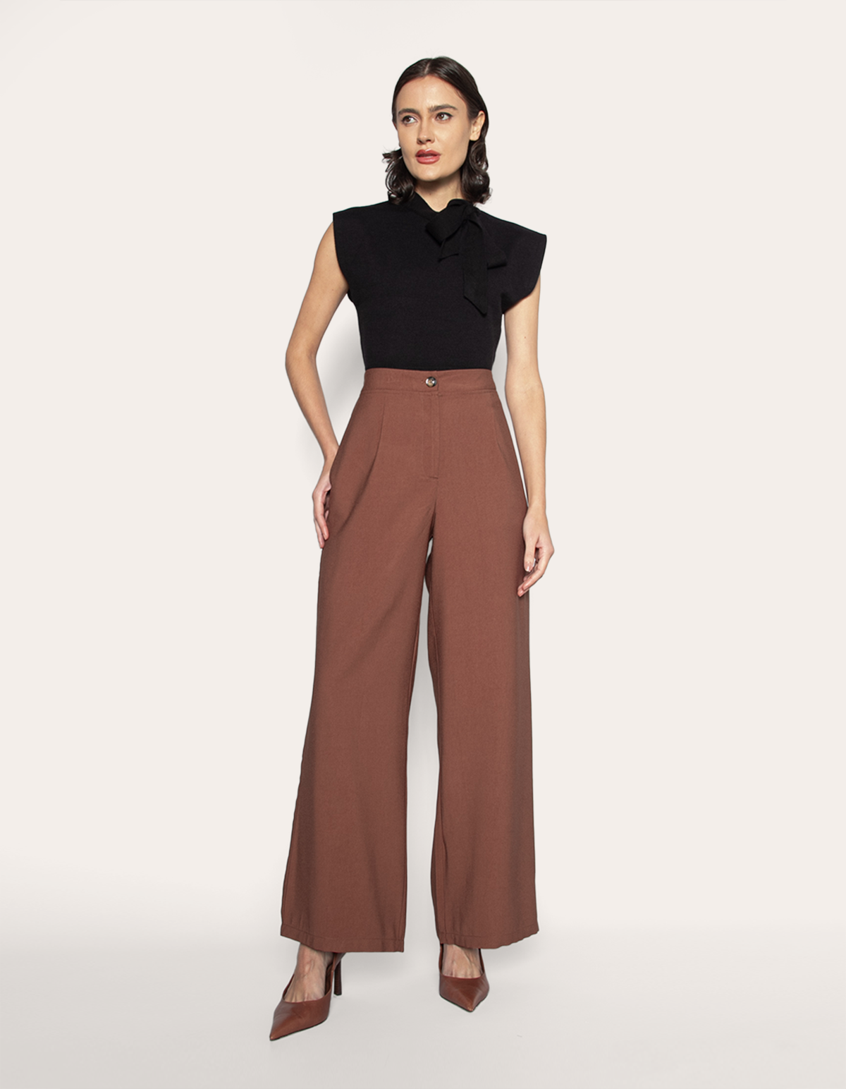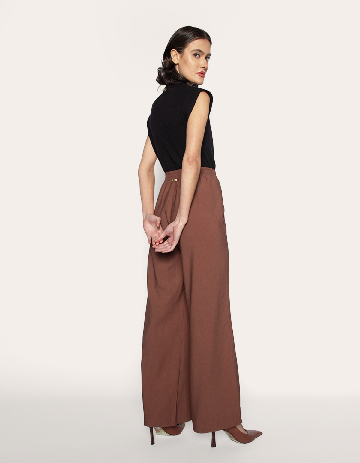 Calça produzida em alfaiataria, um tecido estruturado com caimento elegante. possui cintura alta, fechamento frontal por botão e zíper fixo, bolsos laterais modelo faca, elástico atrás no cós, modelagem pantalona e barra simples. design que valoriza a silhueta, garantindo um caimento impecável.