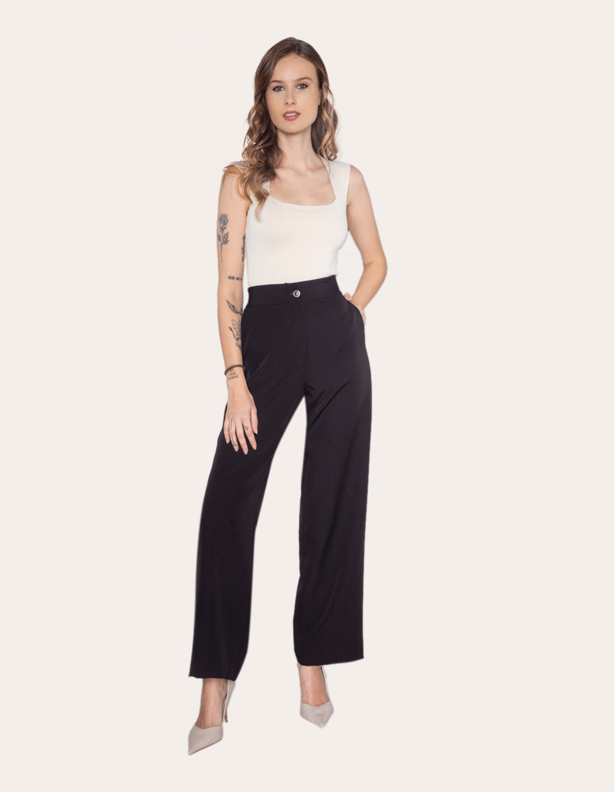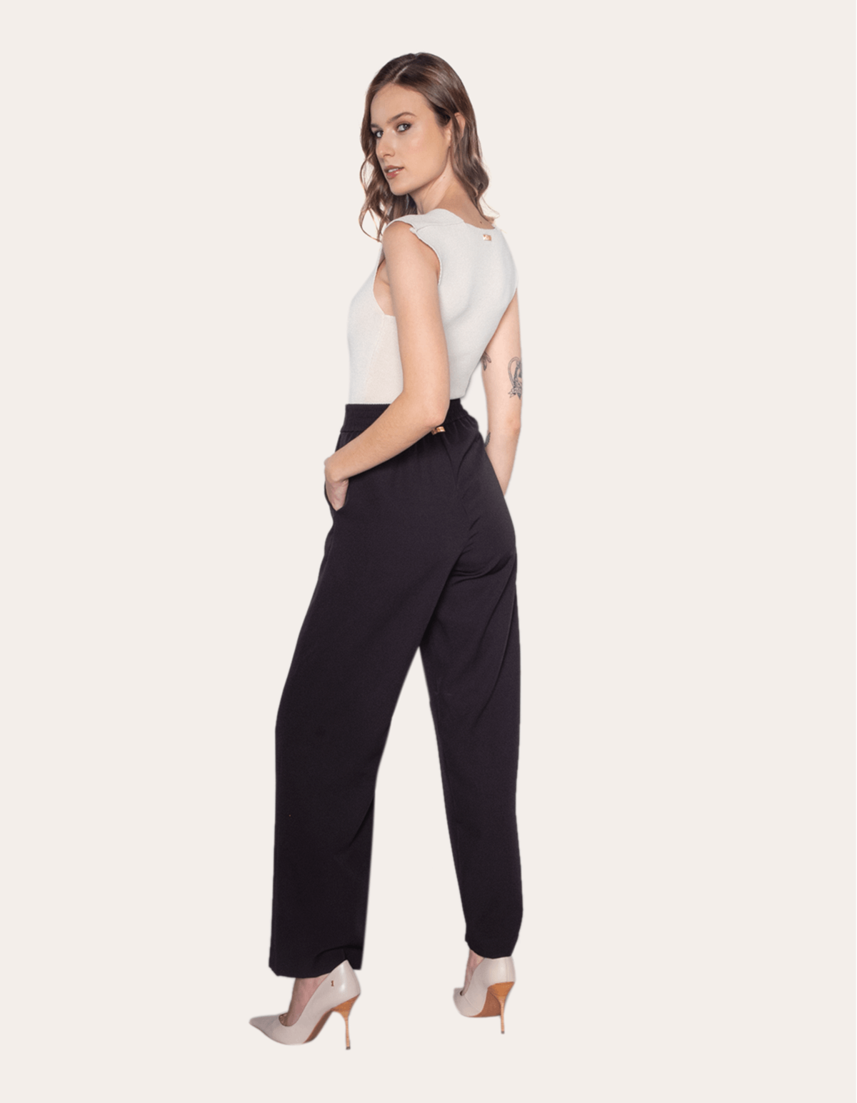 Calça pantalona alfaiataria, possui fechamento por botão e zíper, meio cós elástico nas costas, se adequando perfeitamente ao seu corpo, proporcionando um ajuste flexível e uma sensação de liberdade ao se movimentar. a calça traz a versatilidade do dia-a-dia e praticidade do ""eu estou pronta"" para qualquer ocasião. peça atemporal.