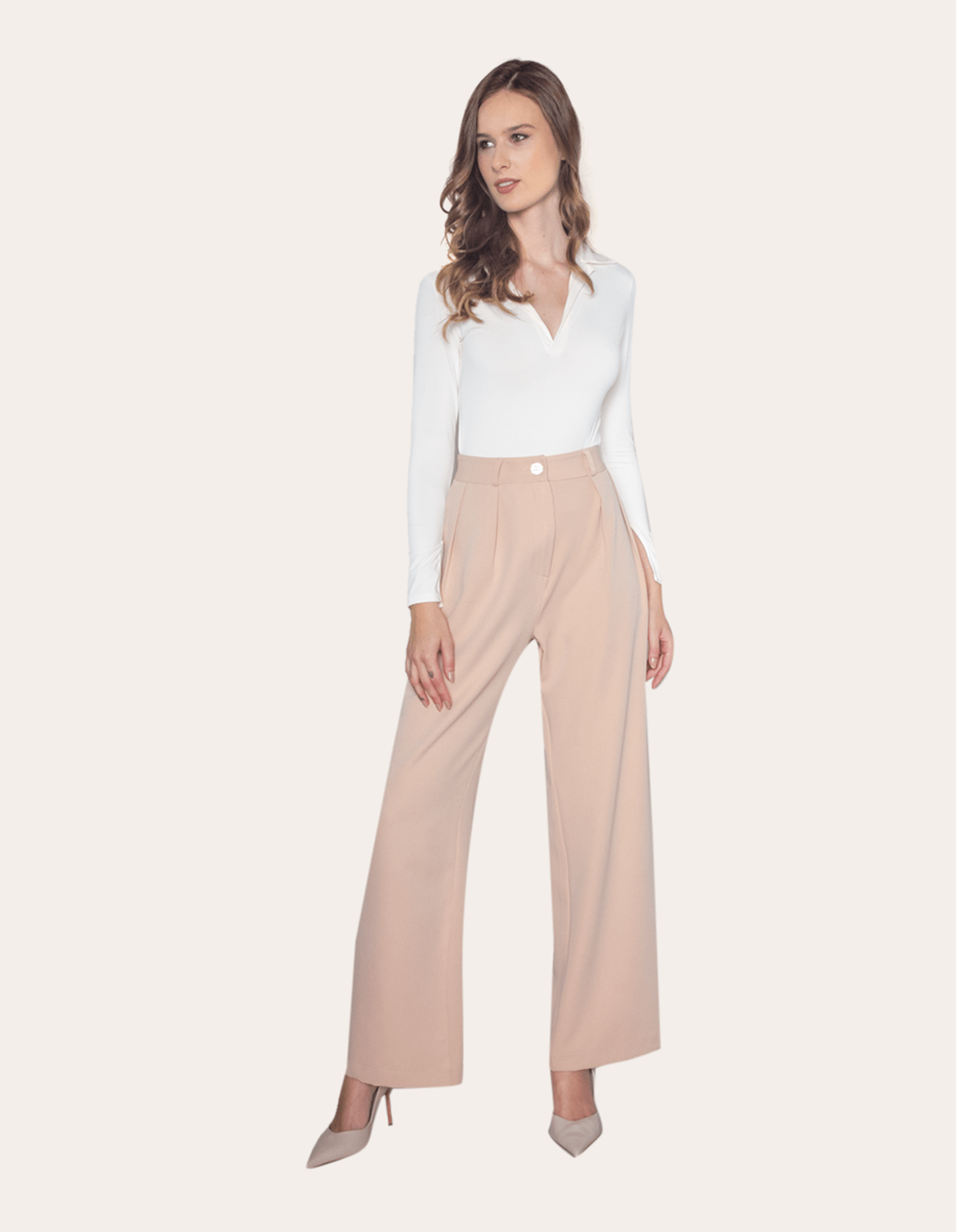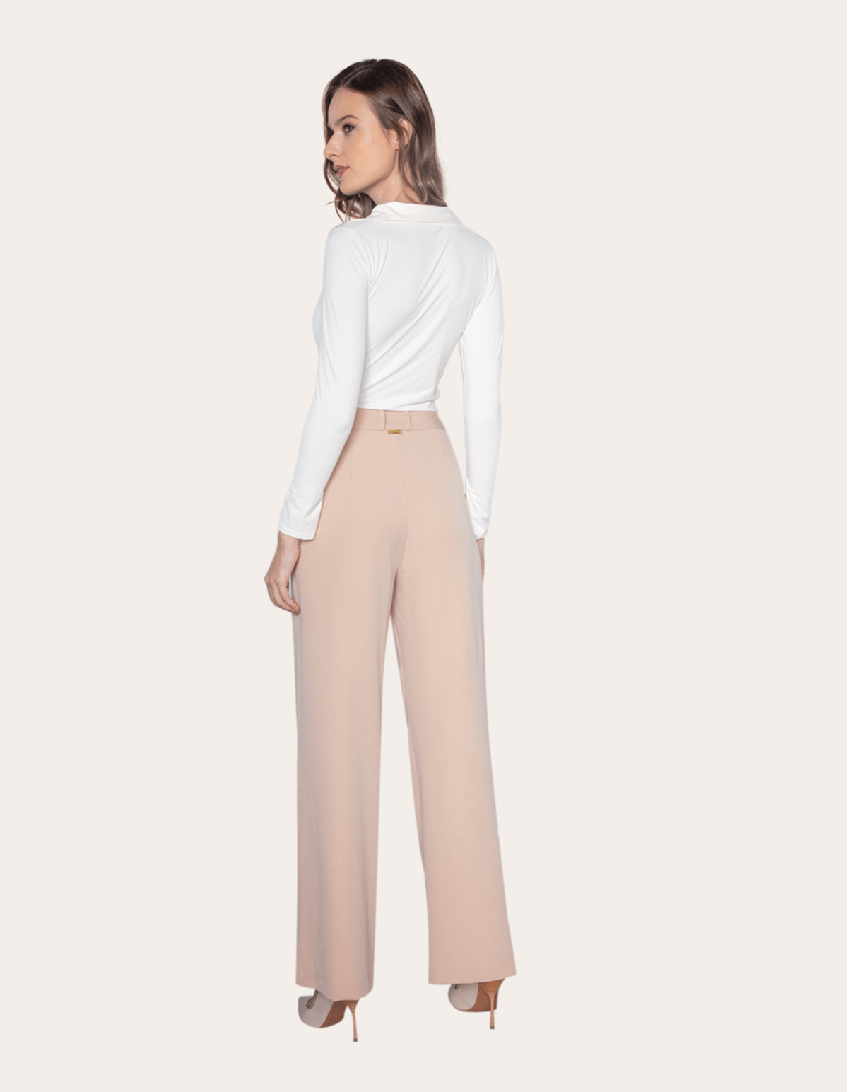Calça modelagem pantalona alfaiataria, fechamento por botão e zíper, possui bolso faca na lateral e pregas duplas (frente e costas), deixando o caimento ainda mais bonito. a tendência perfeita tanto pra looks refinadinhos quanto com peças despojadas.
