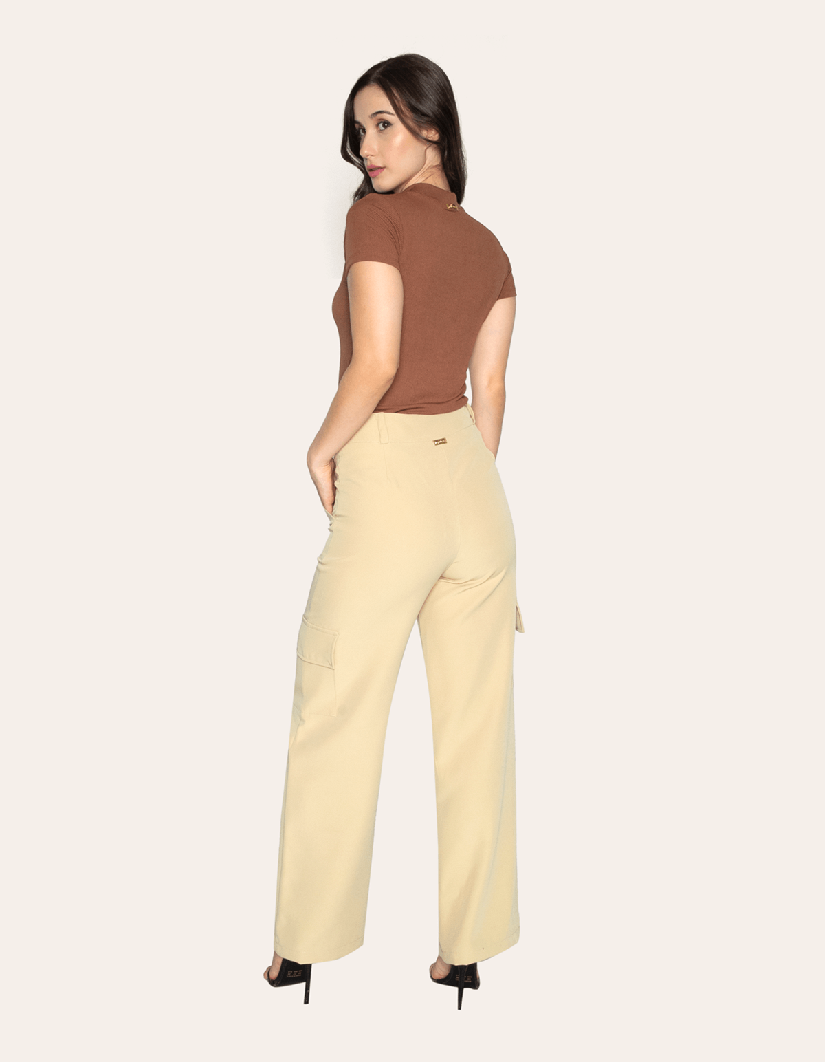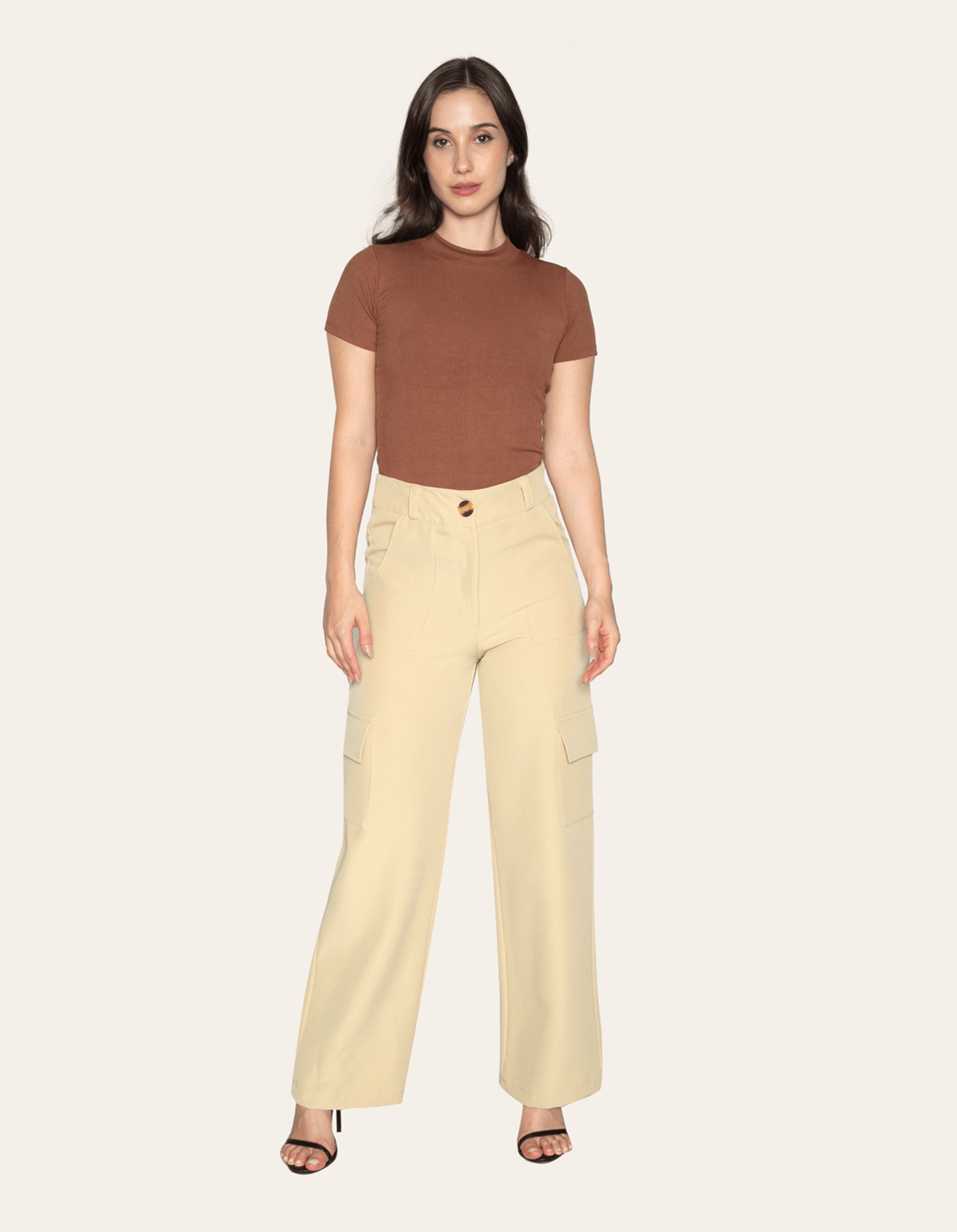 A calça possui modelagem mais larga no estilo pantalona, bolsos nas laterais estilo cargo e abertura frontal em botão e zíper. é uma peça elegante e versátil para mulheres que desejam um visual moderno e confortável.