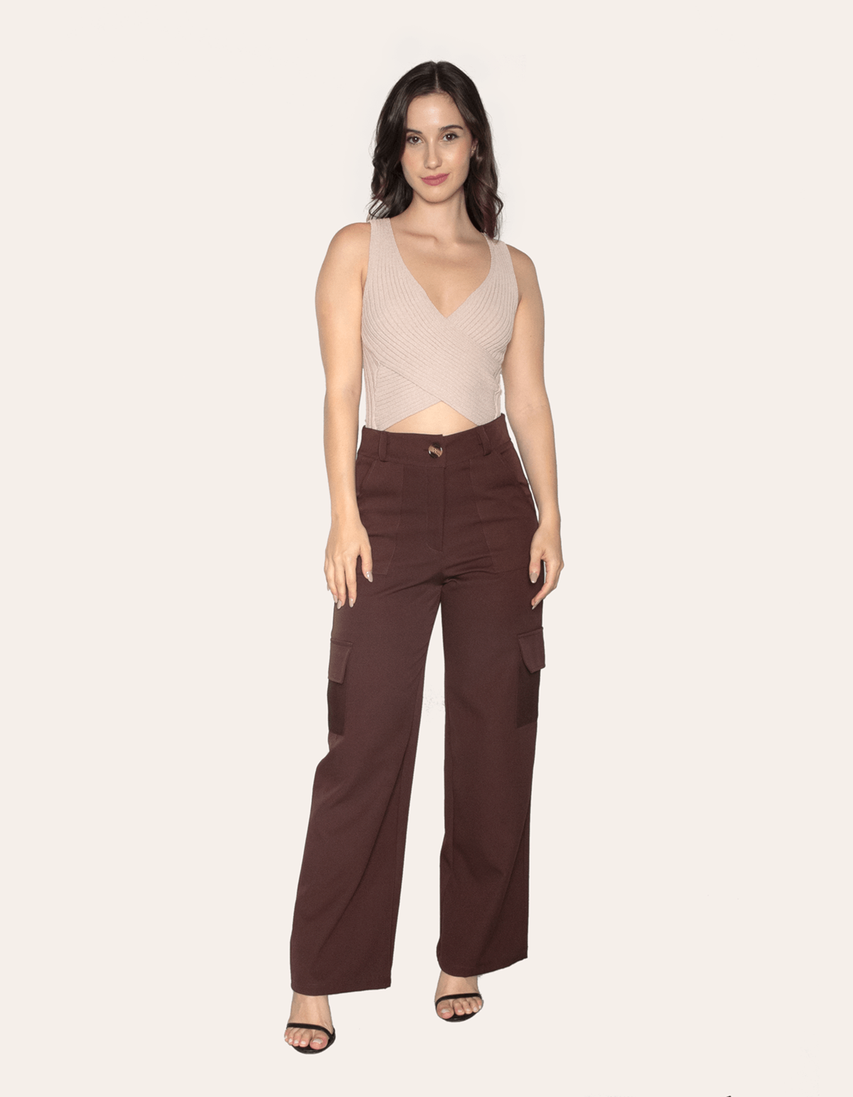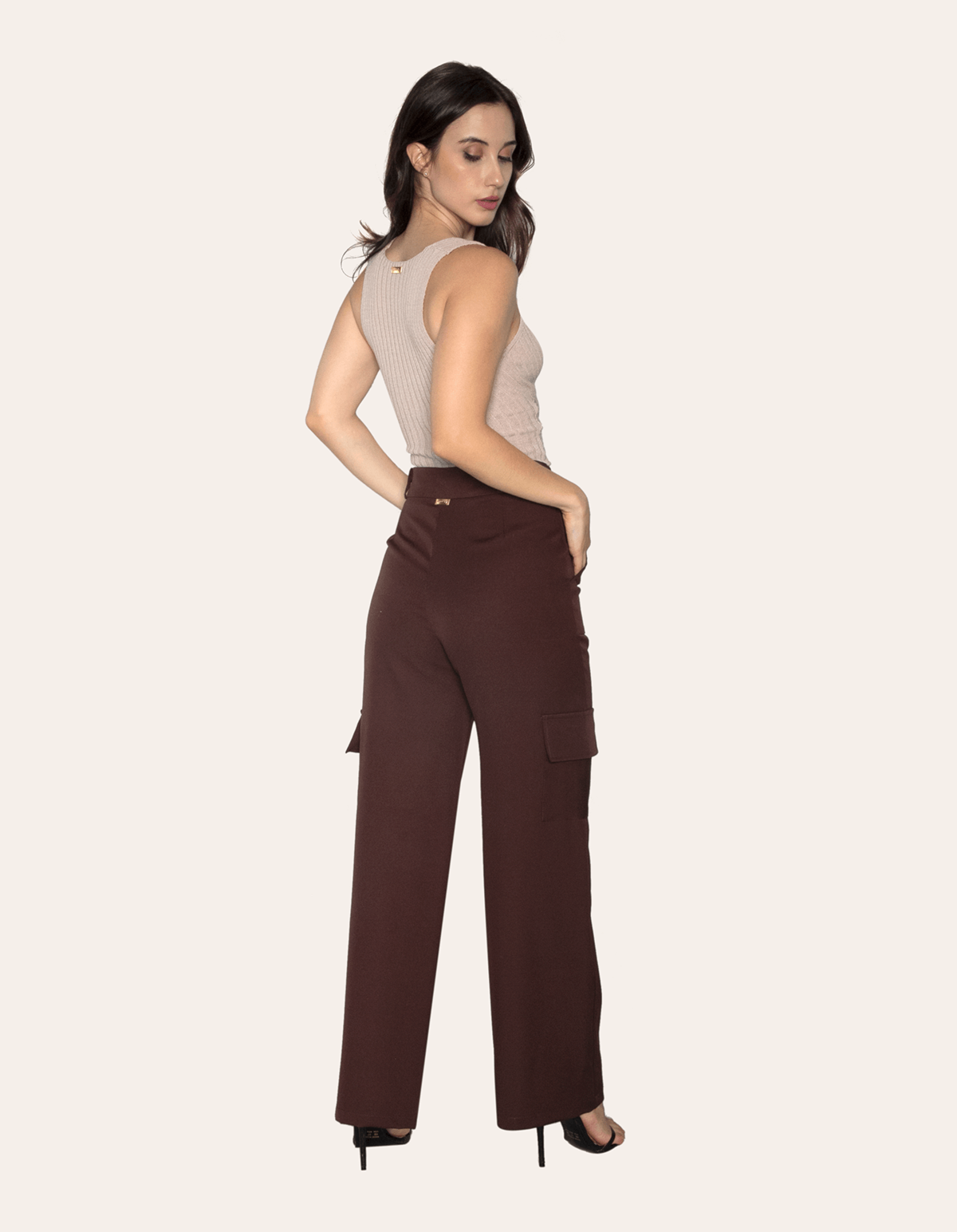 A calça possui modelagem mais larga no estilo pantalona, bolsos nas laterais estilo cargo e abertura frontal em botão e zíper. é uma peça elegante e versátil para mulheres que desejam um visual moderno e confortável.