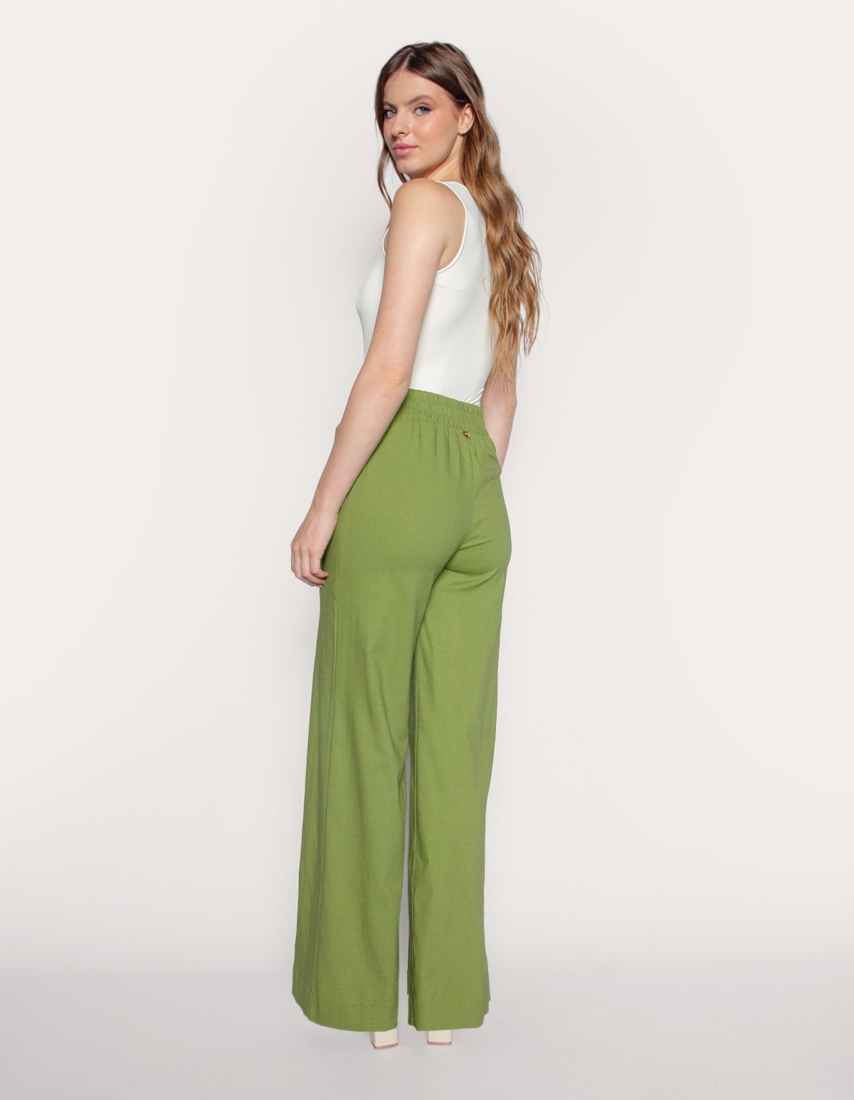 Calça pantalona confeccionada em viscose com linho. Possui cós com passante acompanhado de cinto faixa meia argola no mesmo tecido e elástico franzido na cintura costas, bolsos faca funcionais. É a escolha perfeita para quem busca conforto e estilo!