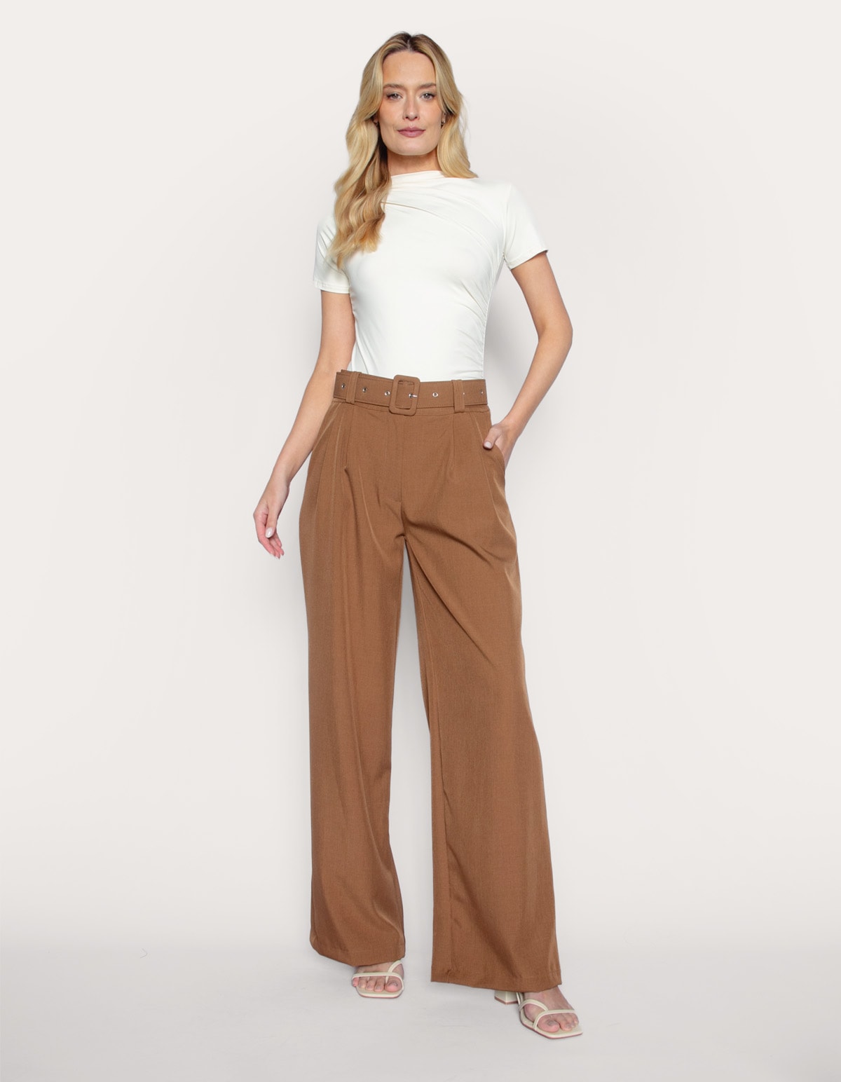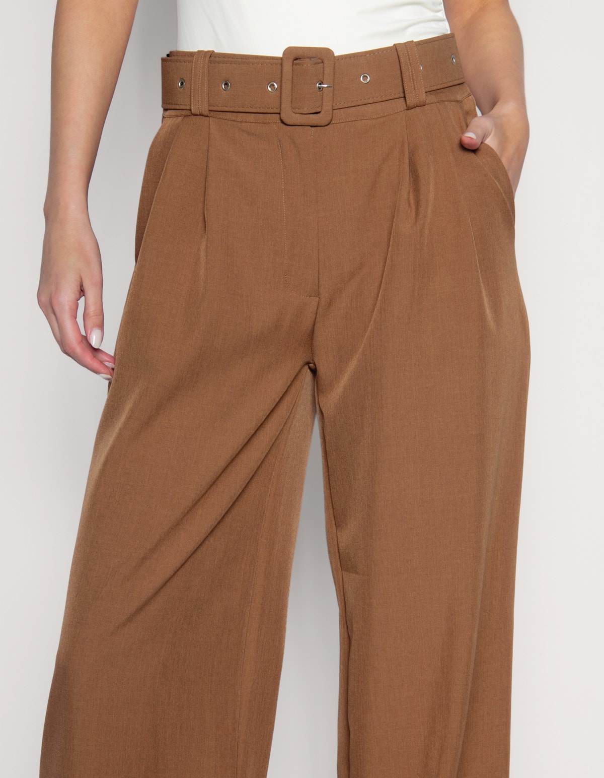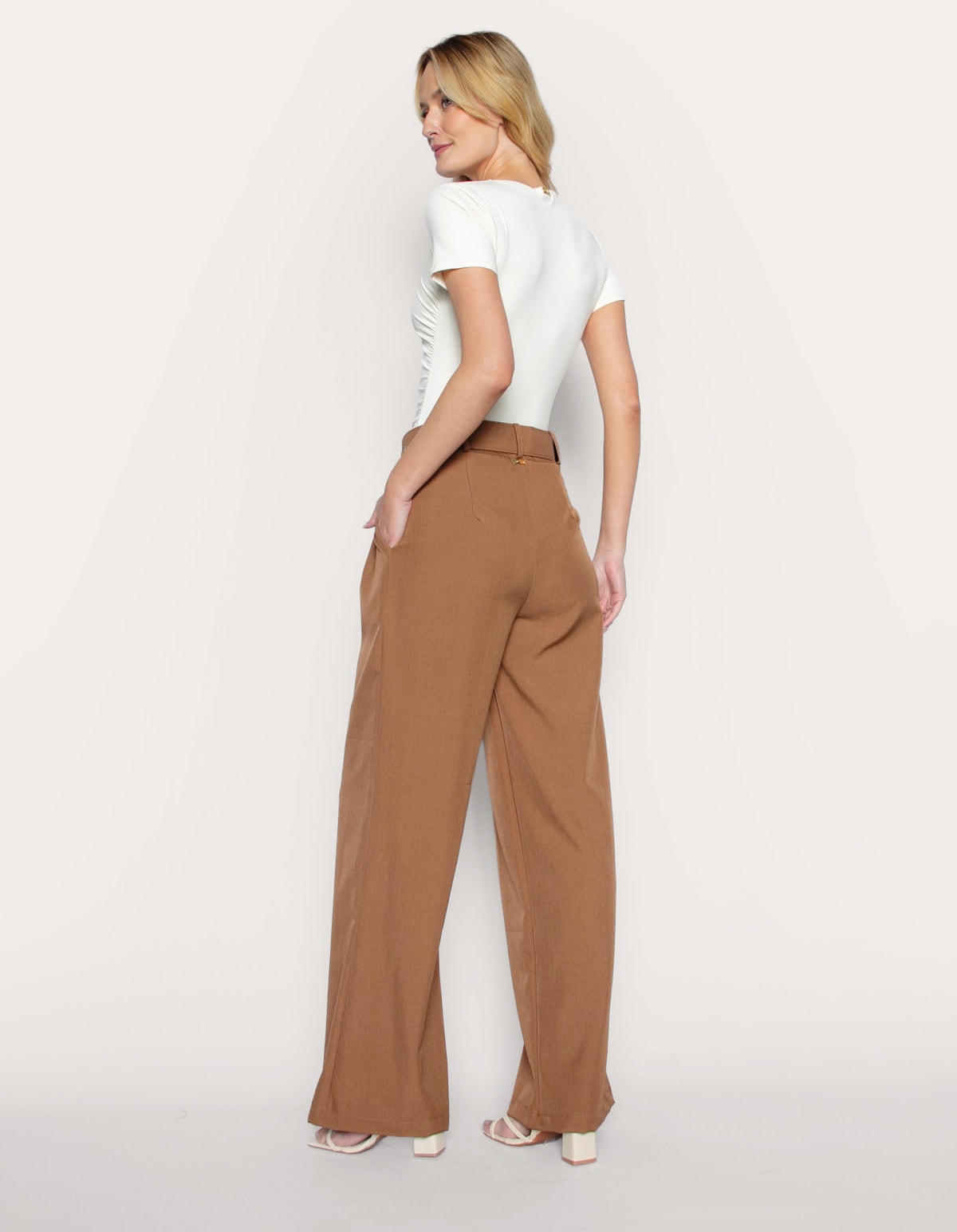 Calça de alfaiataria moderna, cintura alta, corte amplo e reto, possui pregas frontais que dão volume e caimento elegante, possui bolsos laterais tipo faca. A calça vem com um cinto forrado no mesmo tecido, fixado com passantes é ajustado por fivela quadrada criando um visual monocromático na cintura. De corte elegante e confortável, ela é ideal para looks mais formais ou fashion e casuais.