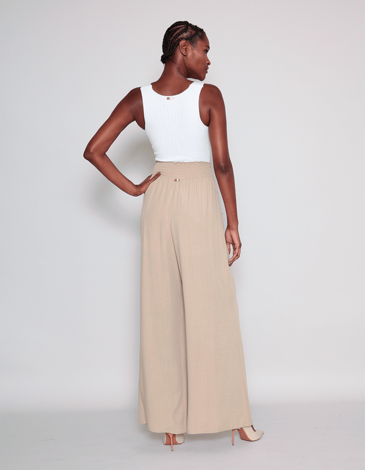 Apresentamos uma calça pantalona de cintura alta com faixa para amarrar, bolsos e elástico no cós na parte de trás. esta peça combina estilo e funcionalidade, permitindo ajuste personalizado com a faixa e garantindo conforto com o elástico. os bolsos laterais acrescentam praticidade ao design. ideal para ocasiões casuais ou especiais, oferecendo um visual contemporâneo com máximo conforto.
